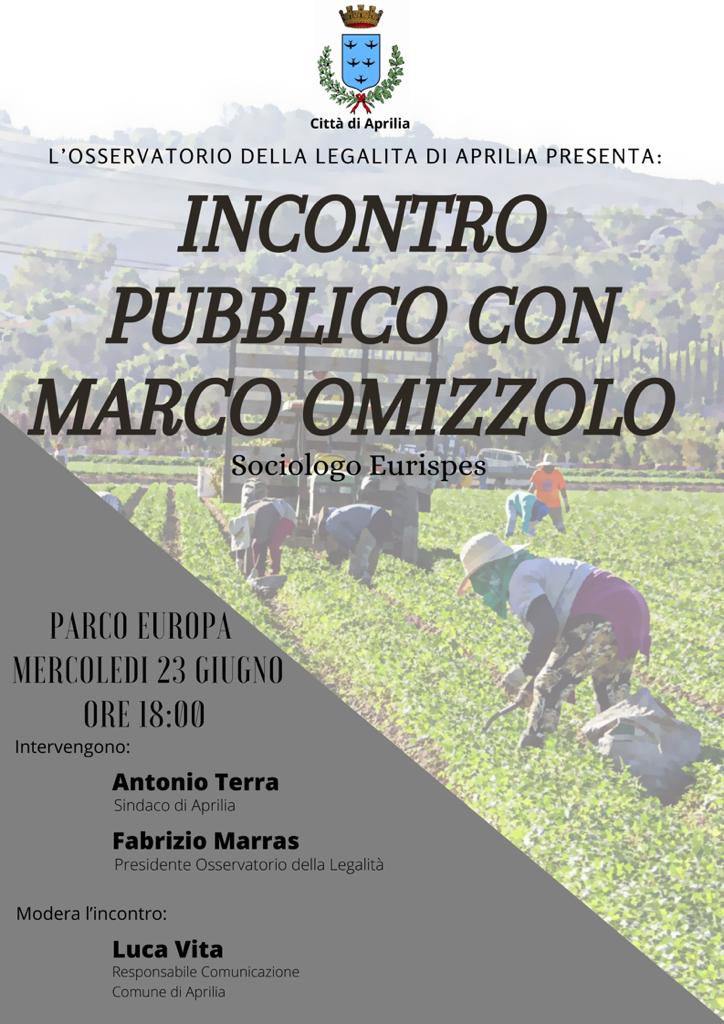 Si terrà mercoledì prossimo, 23 giugno 2021, a partire dalle ore 18:00, presso il parco Europa di via Francia, un incontro pubblico organizzato dall’Osservatorio per la Legalità e la Sicurezza del Comune di Aprilia, con Marco Omizzolo.