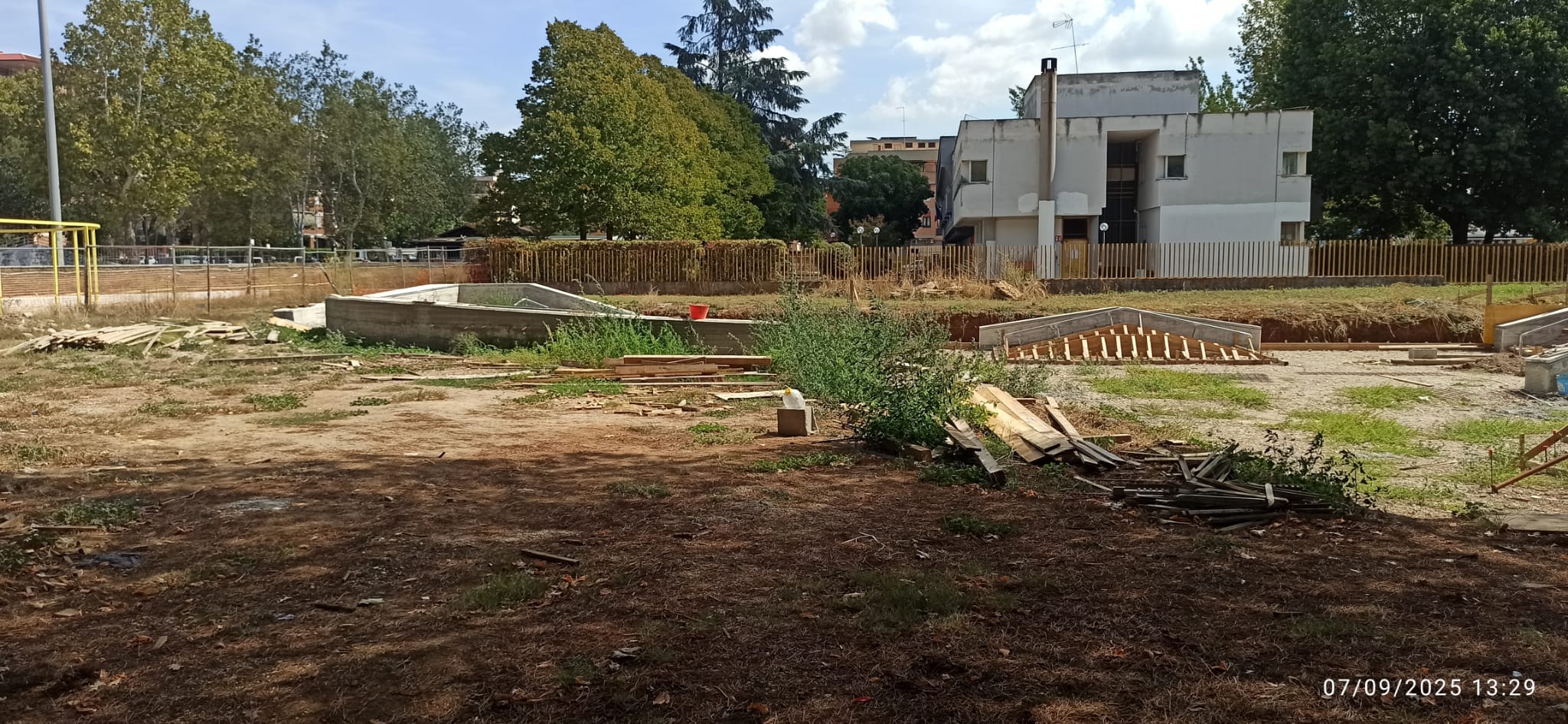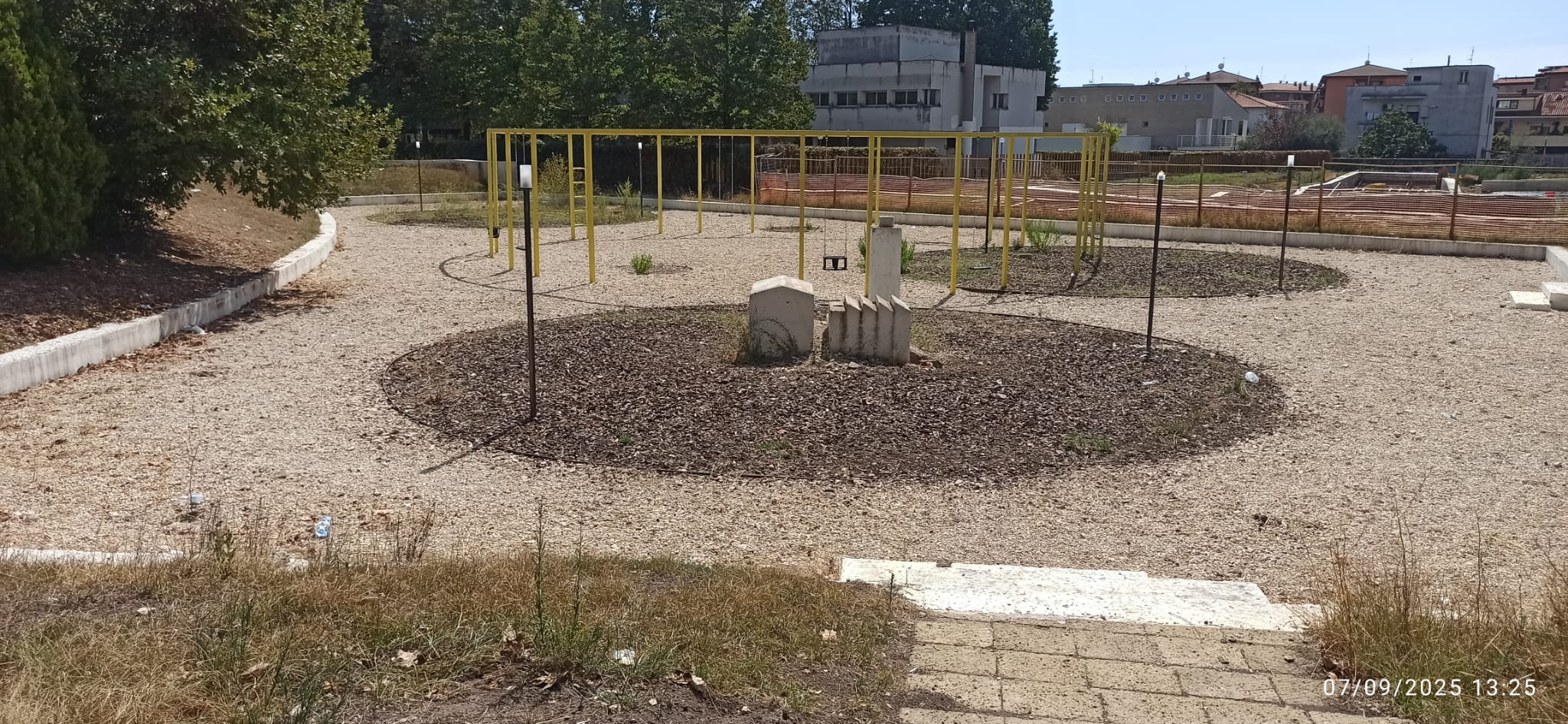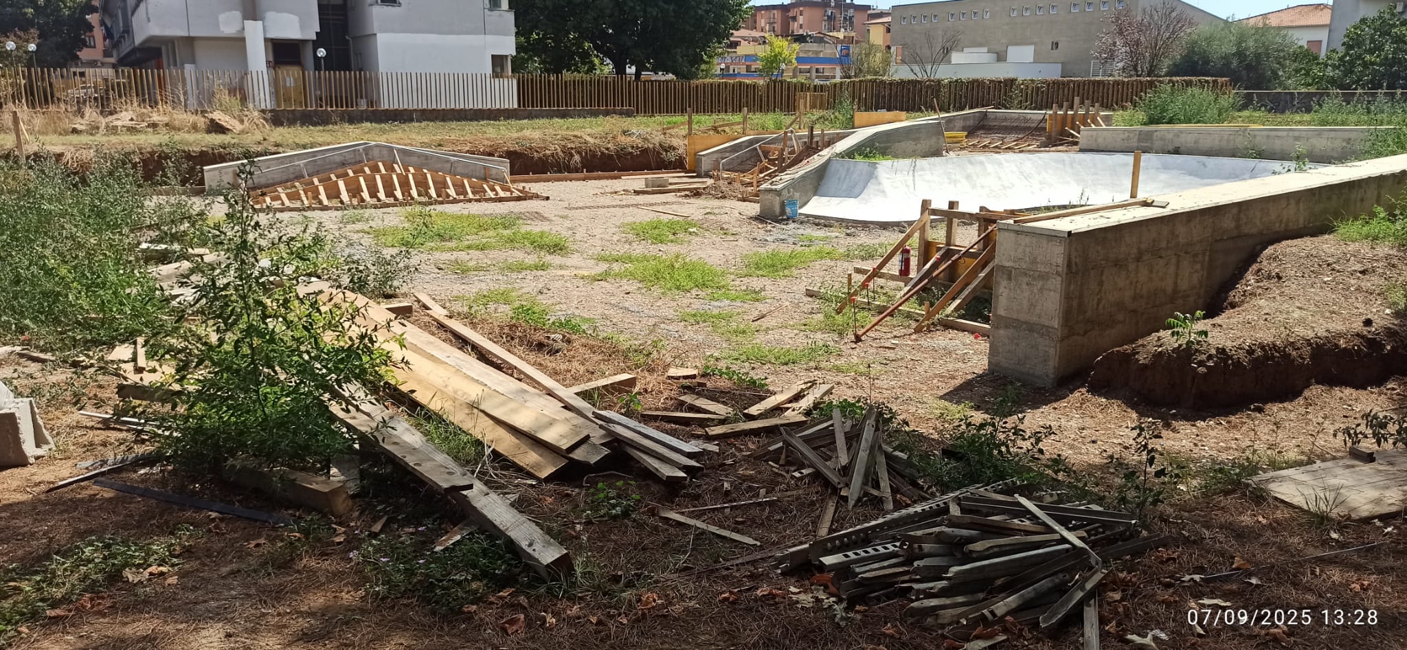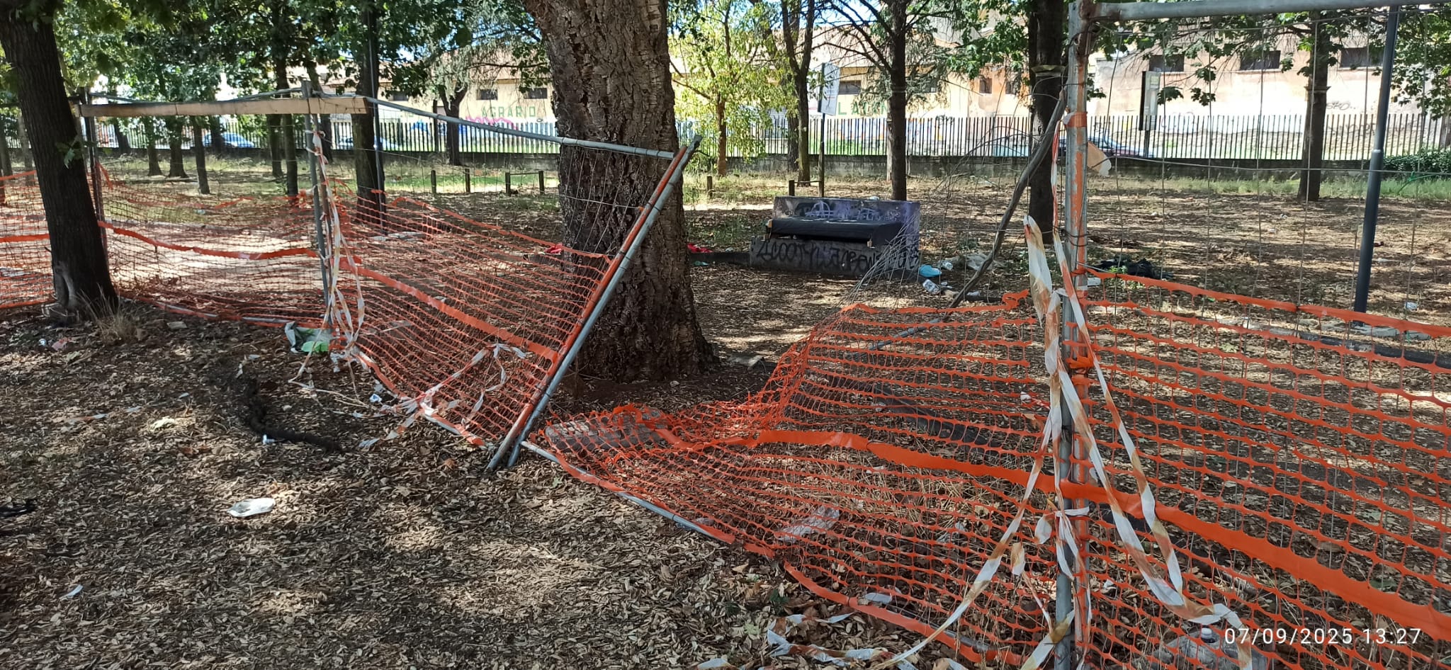 Arrivati davanti al cantiere, sul cartello si legge: ‘Rifunzionalizzazione e riqualificazione delle aree verdi comunali degradate’ eppure, osservando all’interno della recinzione, sembra che sia stato proprio il cantiere a portare nuovo degrado.
