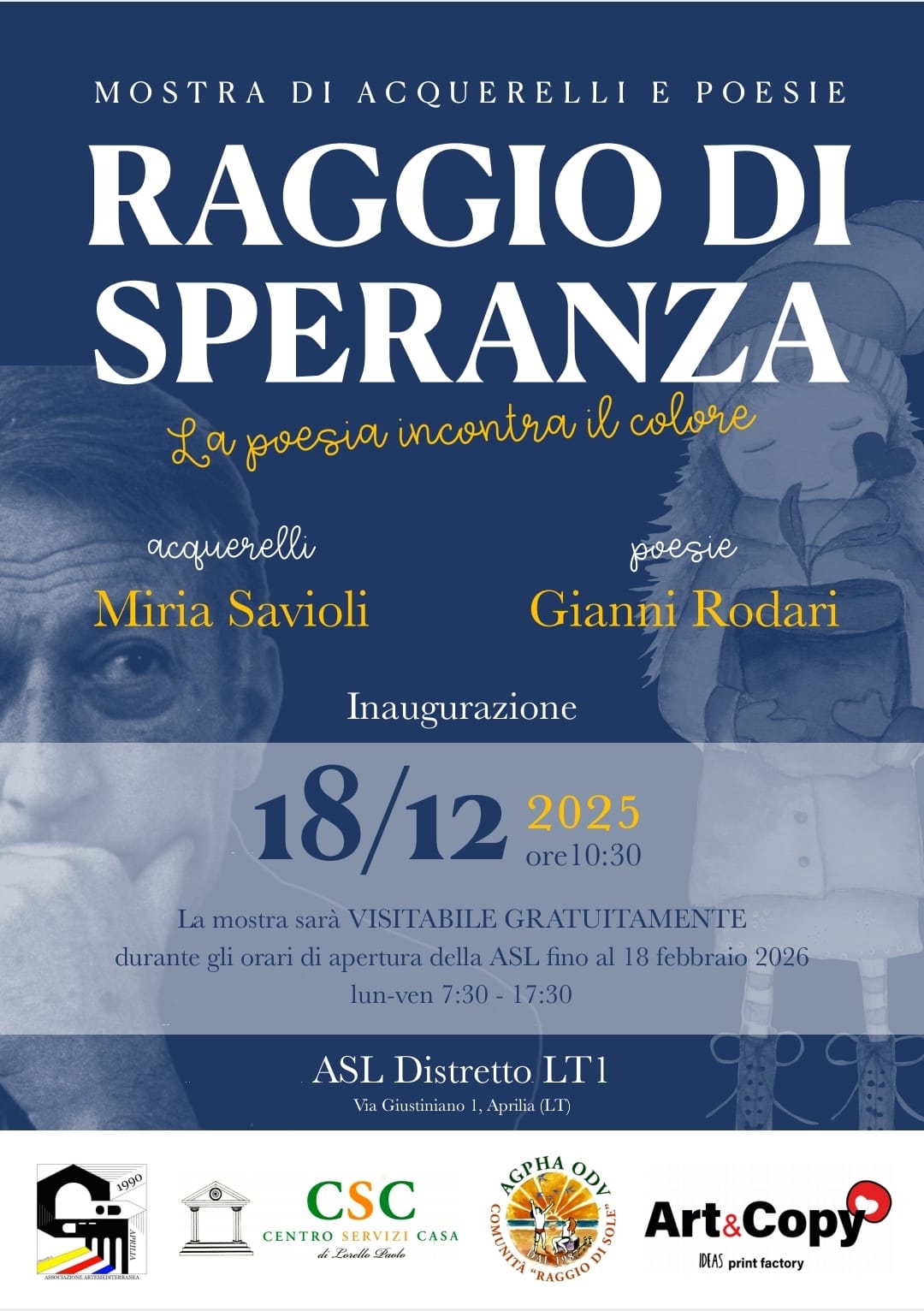 Alla Casa della Salute di via Giustiniano, ad Aprilia, la mostra “Raggio di Speranza” dell’artista Miria Savioli. Verrà inaugurata giovedì 18 Dicembre alle 10.30. Nell’iniziativa sarà coinvolta anche l’Associazione Agpha e la comunità “Raggio di Sole” di Aprilia. Le opere - allestite al primo piano della palazzina B, nella sala d’aspetto della Direzione - saranno visibili, gratuitamente, fino al 18 febbraio negli orari di apertura della Asl.