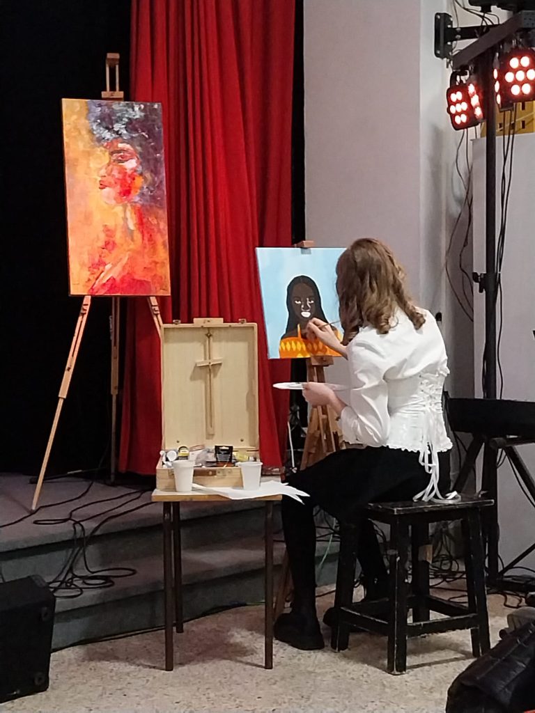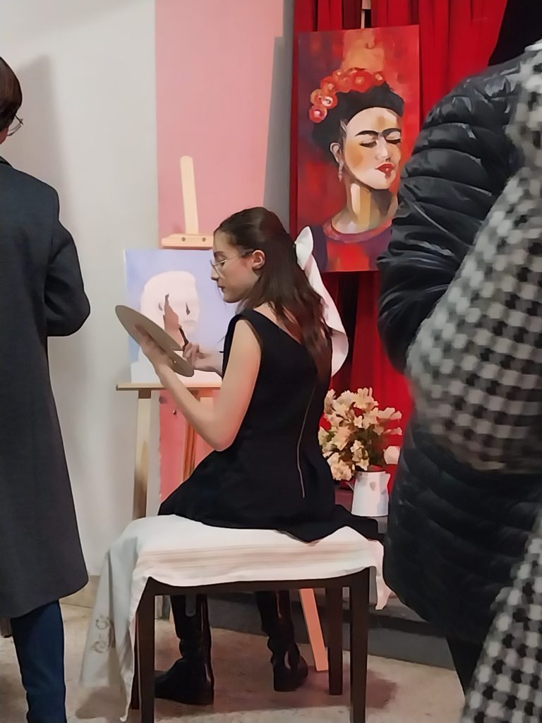 Davanti ad un pubblico entusiasta e partecipe che ha riempito completamente l’Aula Magna, si sono alternati sul palco, con la sapiente direzione artistica di Maria Paola Pedditzi e della professoressa Rita Nuti, le scenografie artistiche a cura di Erika Mallardi e con l’accompagnamento musicale del M. prof. Gianluca Pagliuso, gli alunni del coro della “Pascoli”, il coro dei “Liberi Cantores” e brani recitati o cantati da Sara Berrè, Pietro Di Natale, Katia Sartori,Maria Pia Fenzied anche dal dirigente scolastico, prof. Ciro Scognamiglio. Durante tutto l’evento, ai lati del palco due alunne, Gaia Bellanti ed Emma Di Tullio della 3a D, allieve delle prof.ssa Alessandra Scena, hanno dipinto due quadri, rivelando al pubblico presente il loro assai promettente talento.