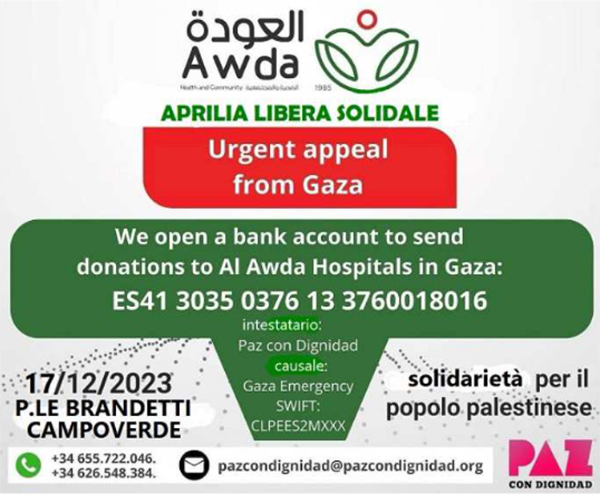 “Allestiremo, insieme a loro, - spiega Aprilia Libera - una Natività con oggetti riciclati e riusati, sotto l'albero del piazzale illuminato con energia solare. E proporremo stand artigianali, un piccolo mercatino natalizio, un Babbo Natale con la slitta, degustazioni di prodotti bio e cibo di strada. Il ricavato andrà all'ospedale di Gaza ‘Al Awda’ e a coprire le spese legali per tutelare il diritto di vivere in un ambiente salubre”.
