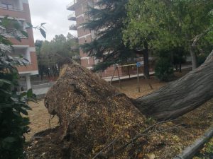 Un albero completamente sradicato a causa del maltempo in Via Bixio ad Aprilia. Fortunatamente senza conseguenze per le persone, i rami sono finiti sulle auto in sosta.