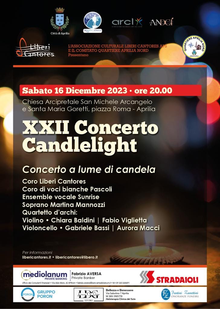 Sabato 16 dicembre alle 20 presso la chiesa arcipretale San Michele Arcangelo e Santa Maria Goretti in piazza Roma si terrà la XXII edizione del Concerto Candlelight, concerto al lume di candela. Anche in questo caso oltre ai Liberi Cantores ci saranno il coro “Sunrise”, il coro voci bianche Pascoli, il quartetto d’Archi e Martina Mannozzi.