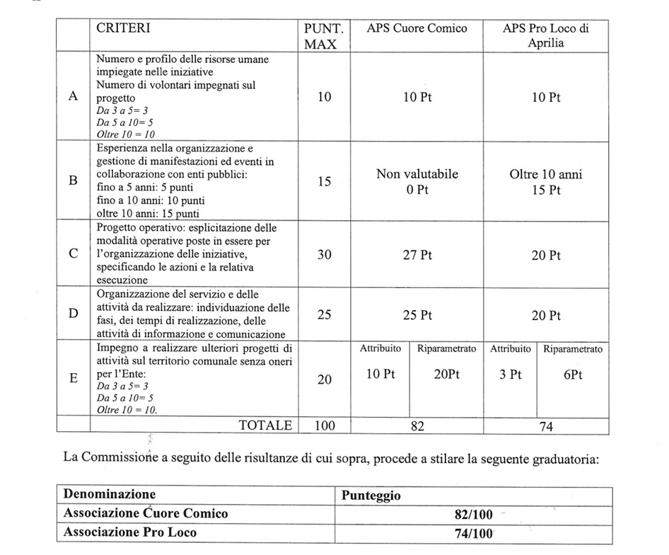Eventi ed attività culturali: ad Aprilia ora ci penserà l’associazione “Cuore Comico”. E’ infatti questo il risultato della procedura comparativa avviata dalla Commissione Straordinaria con Avviso Pubblico e rivolta ad organizzazioni di volontariato ed associazione di promozione sociale. A rispondere all’avviso solo due realtà: Cuore Comico, per l’appunto, e la Pro Loco di Aprilia che ha gestito i grandi eventi fino a poche settimane fa. Le domande presentate dalle due associazioni sono state esaminate il 3 marzo scorso dalla commissione composta dalla dirigente del Terzo Settore, Teresa Marino, dal funzionario Marco Patella e dall’istruttore Antonella Martorana con funzione di segretario verbalizzante. Cuore Comico ha ottenuto 82 punti su 100 rispetto ai 74 su 100 della Pro Loco. Con una determina pubblicata ieri è stato affidato dunque l'incarico alla nuova associazione cittadina che si occuperà di organizzare eventi come il Carnevale e il San Michele.