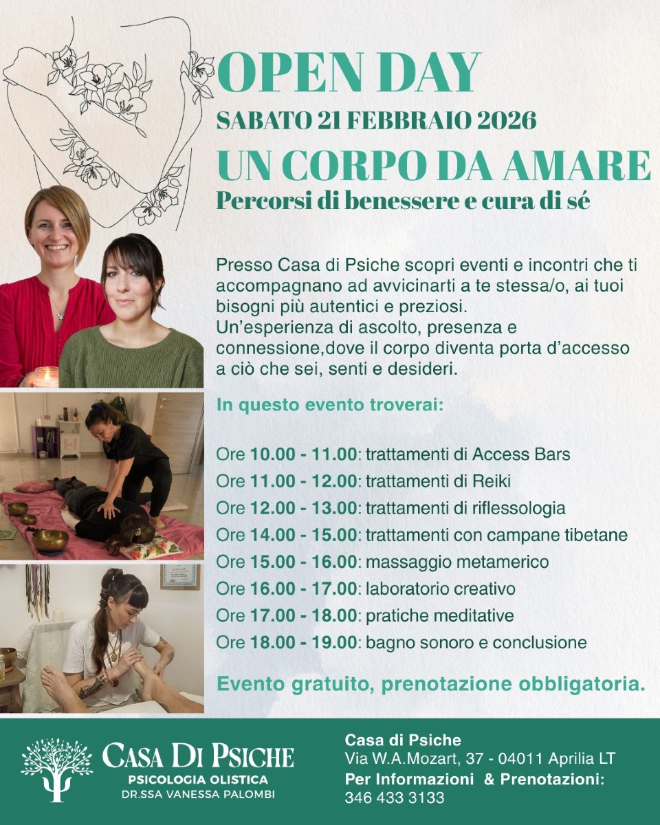 Sabato 21 febbraio ad Aprilia, presso Casa di Psiche - studio di psicologia olistica che ha sede in Via Mozart, 37 - dalle 10.00 alle 19.00 ci sarà un Open Day completamente gratuito intitolato “Un corpo da amare. Percorsi di benessere e cura di sé”.