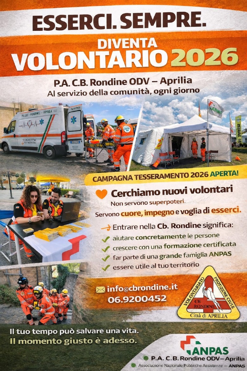 L’associazione di Protezione Civile Cb Rondine di Aprilia è in cerca di nuovi volontari: persone che abbiano voglia di mettersi alla prova e di condividere il loro tempo libero insieme agli altri volontari.