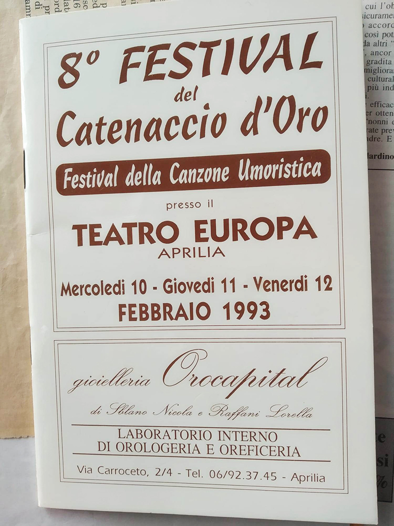 Chi ricorda il festival del “Catenaccio d’Oro”? Due apriliani hanno deciso di celebrarlo a distanza di 30 anni. Il “Catenaccio d’Oro”, per chi non lo sapesse, era un concorso di canzone umoristica che ha animato il Teatro Europa di Aprilia tra la fine degli anni ‘80 e gli inizi degli anni ’90; una manifestazione che si è ripetuta almeno per una decina di edizioni, e che veniva organizzata all’epoca dal maestro Alvaro Fiacconi, dal fratello Franco (assieme i due componevano canzoni e musiche) e a molti altri cittadini apriliani, con la coordinazione di Fabio Battagliero. A votare le canzoni vincitrice era direttamente il pubblico, assieme ad una giuria.