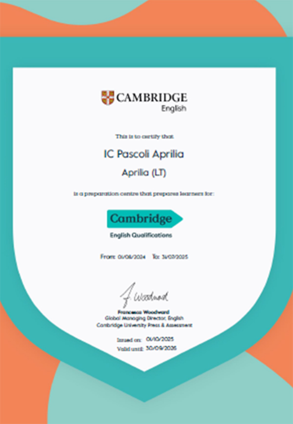 Da anni ormai l’Istituto Comprensivo “Giovanni Pascoli” di Aprilia è un Cambridge Authorised Preparation Center, un traguardo che testimonia l’impegno costante della scuola nella promozione dello studio delle lingue straniere e nella formazione di studenti pronti ad affrontare un mondo sempre più internazionale.