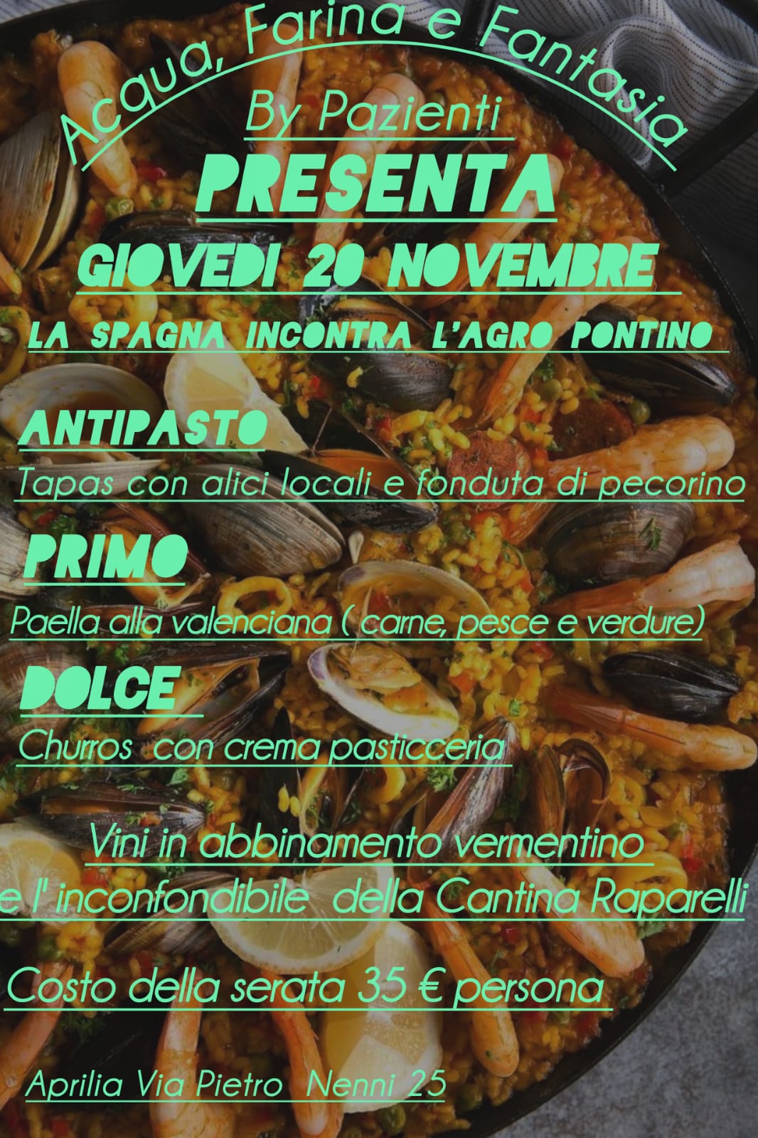 Aprilia, da “Acqua, Farina e Fantasia” la Spagna incontra l’Agro Pontino: serata con paella, tapas e churros.