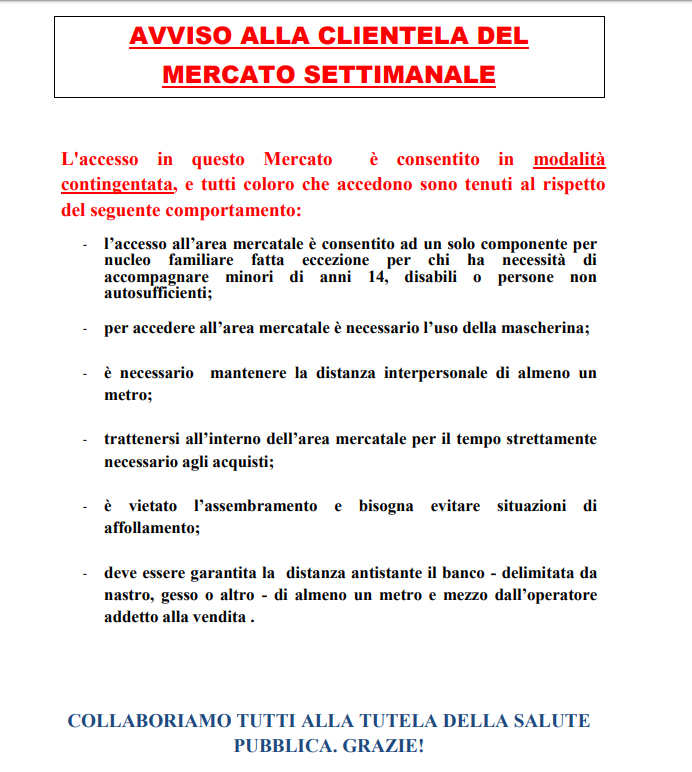 L’ordinanza, che sospende anche le attività di spunta dei posteggi lasciati liberi, prevede un numero massimo di 160 clienti ammissibili nell’area di mercato. È consentito l’accesso ad un solo componente per nucleo familiare e l’obbligo della mascherina. La distanza interpersonale deve essere di almeno un metro, un metro e mezzo tra l’operatore addetto alla vendita e il cliente. Sarà cura dei commercianti delimitare l’area antistante il banco, in modo tale da garantire tali distanze.