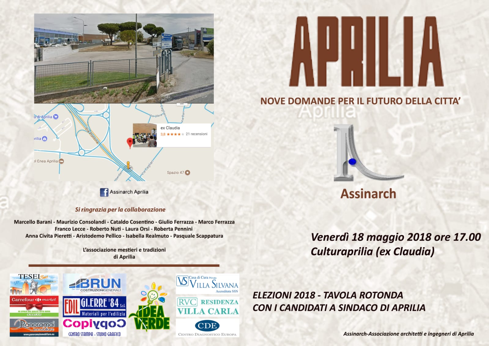 Si terrà domani pomeriggio dalle 17.00 (18 maggio 2018) la tavola rotonda “9 domande sul futuro della città” organizzata dall’Assinarch di Aprilia. L’appuntamento è presso i locali del CulturAprilia s...