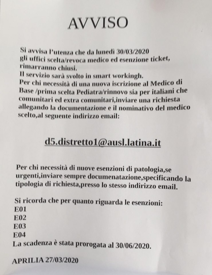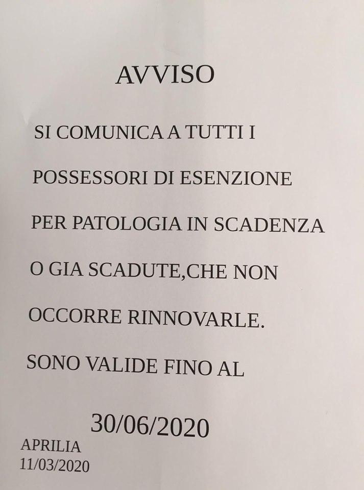 Il Tribunale per i diritti del malato di Aprilia vuole ribadire ai cittadini così come più volte postato nella pagina Facebook della casa della Salute Casa, che la validità delle Esenzioni per reddito e per patologia in scadenza il primo di Marzo, è stata prorogata fino al 30 di Giugno. Questo servizio comunque così come per la scelta/revoca del medico viene garantito online scrivendo a: [email protected]