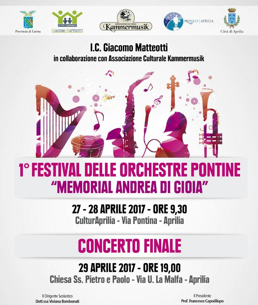 Si terrà giovedì 20 aprile, alle 12 presso la Sala Ragazzi della biblioteca comunale “Giacomo Manzù” di Aprilia, la conferenza stampa di presentazione del primo Festival delle Orchestre Pontine “Memorial Andrea Di Gioia”, promosso dall’istituto comprensivo Giacomo Matteotti in collaborazione con l’Associazione Kammermusik e con il Patrocinio del Comune di Aprilia e della Provincia di Latina.