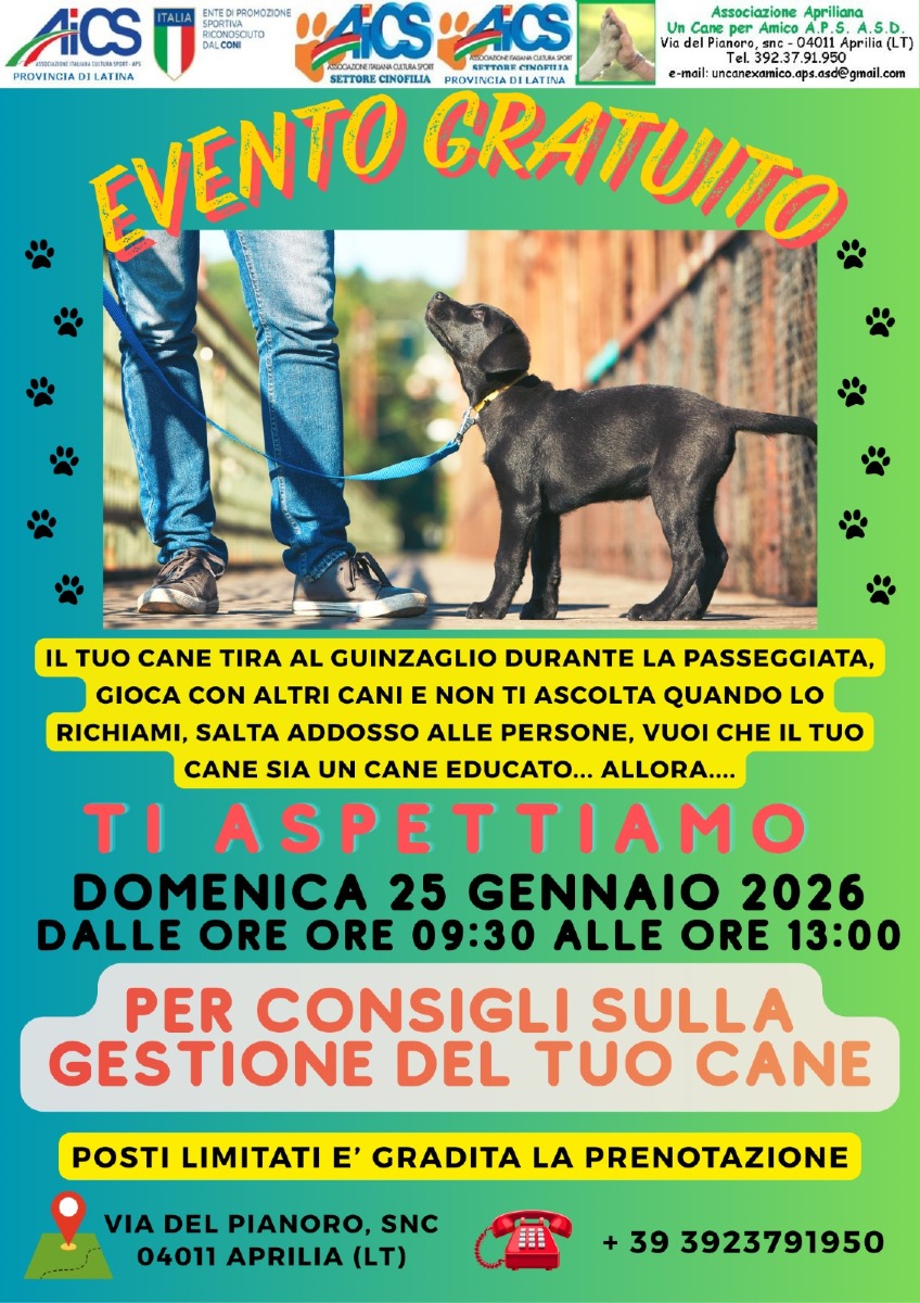 Gestione dei propri cani. L’associazione “Un Cane per Amico” di Aprilia organizza un evento gratuito per domenica prossima, 25 gennaio, e mette a disposizione i propri tecnici, per dare consigli utili. L’appuntamento è dalle 9.00 alle 13.00 presso il Centro Cinofilo di via del Pianoro, ad Aprilia (autorizzato dalla ASL).