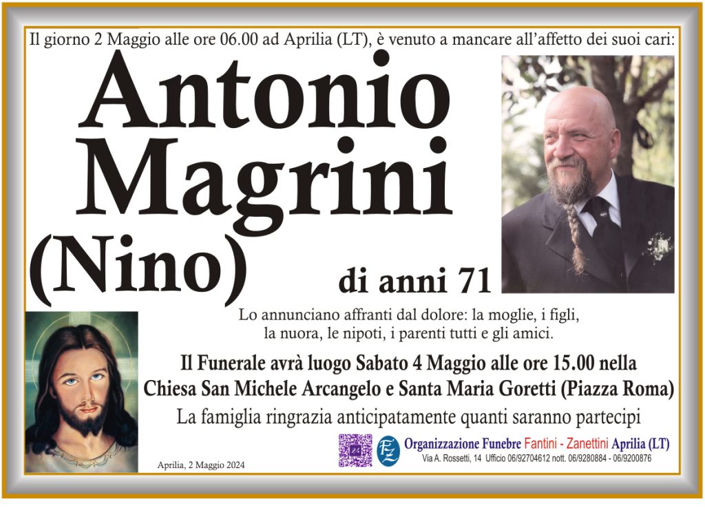 E’ venuto a mancare ad Aprilia - dopo una malattia - lo storico commerciante Antonio Magrini conosciuto come Nino. Aveva 71 anni. Nino Magrini si è spento oggi, attorno alle 6 del mattino, circondato dall’affetto dei suoi cari. La città si stringe attorno al lutto dei familiari. Il funerale si terrà sabato 4 maggio 2024 alle ore 15.00 presso la chiesa di San Michele Arcangelo in piazza Roma.