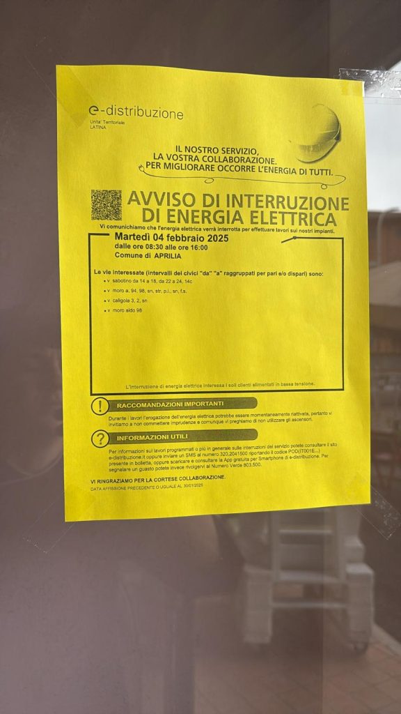 Interruzione elettrica per questo martedì 4 febbraio ad Aprilia. Coinvolte una parte di via Aldo Moro, ma anche via Caligola e via Sabotino. L’interruzione è prevista dalle 8.30 del mattino e fino alle 16.30 per permettere ai tecnici di E-Distribuzione di effettuare dei lavori sugli impianti. Alcune attività commerciali resteranno chiuse.