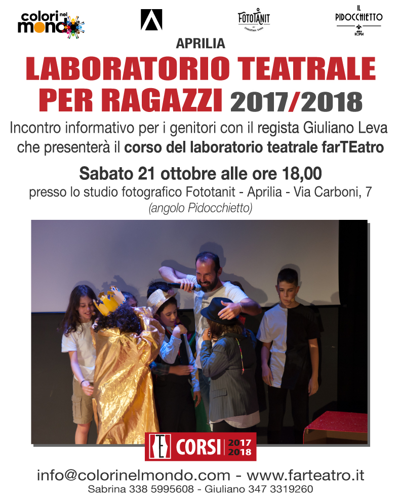 L’associazione “Colori nel Mondo” di Aprilia ha organizzato per domani un incontro tra il regista apriliano Giuliano Leva ed i genitori dei ragazzi che frequentano il laboratorio teatrale “farTEatro”. L’appuntamento è per domani, sabato 21 ottobre, alle 18.00, presso lo studio fotografico Fototanit di via Carboni, 7.