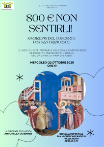 “800 e non sentirli”. È il titolo della XI edizione del concerto per San Francesco che coinvolge oltre 250, tra bambini e ragazzi della scuola primaria e della secondaria di primo grado dell’Istituto Comprensivo Matteotti. Il concerto si terrà il prossimo mercoledì 22 ottobre presso la chiesa di San Michele Arcangelo alle ore 19. Inizia con questa tradizione ormai consolidata e sentita, un anno di intenso lavoro che porterà l’Istituto Comprensivo Matteotti di Aprilia a commemorare gli 800 anni dalla morte del Santo d’Assisi, patrono d’Italia. Il percorso si chiuderà a maggio con la rappresentazione di un riadattamento del famoso musical “Forza Venite Gente”, che sarà interamente suonato, cantato e recitato dalla sezione ad indirizzo musicale della Secondaria di Primo Grado. Saranno proprio le musiche di “Forza Venite Gente”, composizioni dei maestri Paulicelli, De Matteis e Belardinelli, ad essere le protagoniste indiscusse di questa XI edizione del concerto di San Francesco che vedrà l’esibizione delle classi quinte della primaria Deledda e Campoverde e della sezione ad indirizzo musicale della Secondaria di Primo Grado. Musiche riadattate per coro di voci bianche e accompagnate live dai professori di strumento musicale della sezione ad indirizzo musicale. Attraverso le canzoni del musical, saranno ripercorse le tappe della vita e le opere di San Francesco d’Assisi e saranno riattualizzati i suoi messaggi: che significa oggi la povertà, la fraternità, il dialogo, la natura, la provvidenza. Non mancherà una commovente parentesi sulla pace, tema anch’esso molto caro al Santo d’Assisi, che coinvolgerà tutte le arti performative: dalla recitazione, alla musica e alla danza. Non mancherà neppure la bellissima versione, arrangiata per coro a tre voci e accompagnamento strumentale, del Cantico delle Creature, il famosissimo “Laudato sii” di “Forza Venite Gente”.