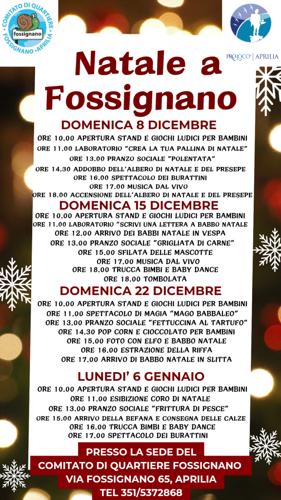 “Natale a Fossignano”, domenica 15 Dicembre il Comitato di Quartiere propone giornata di festeggiamenti, con un laboratorio e l’arrivo dei Babbi Natale in Vespa di mattina, un pranzo sociale, e poi nel pomeriggio animazione a partire dalle 15.00 e tombolata alle 18.00. L’appuntamento è in via Fossignano, 65.