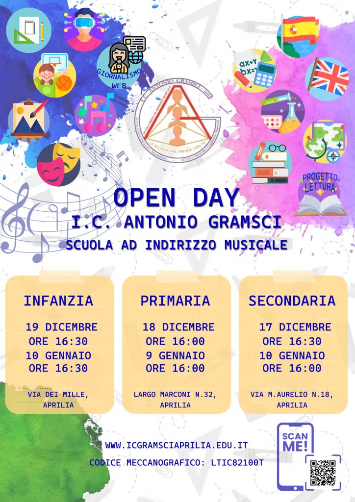 E oggi è in programma anche l'open day presso la scuola Gramsci di Aprilia. Questo martedì 17 dicembre si inizia alle ore 16.30 con la scuola secondaria di primo grado in via M. Aurelio n. 18.