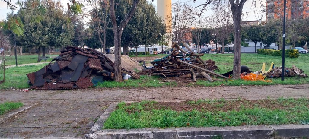 - gli operai comunali hanno lasciato ammassati i resti dei giochi e si è creata una discarica a cielo aperto, in cui incivili lasciano di tutto (grazie anche alla mancata illuminazione)