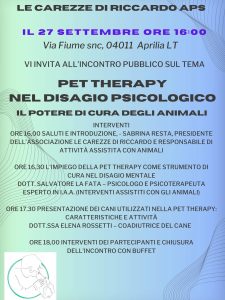 Aprilia, incontro pubblico su “Pet therapy nel disagio psicologico, il potere di cura degli animali”. E’ quanto ha organizzato l’associazione Le Carezze di Riccardo APS presso la sua sede in via Fiume. Appuntamento a sabato 27 settembre alle 16.00.