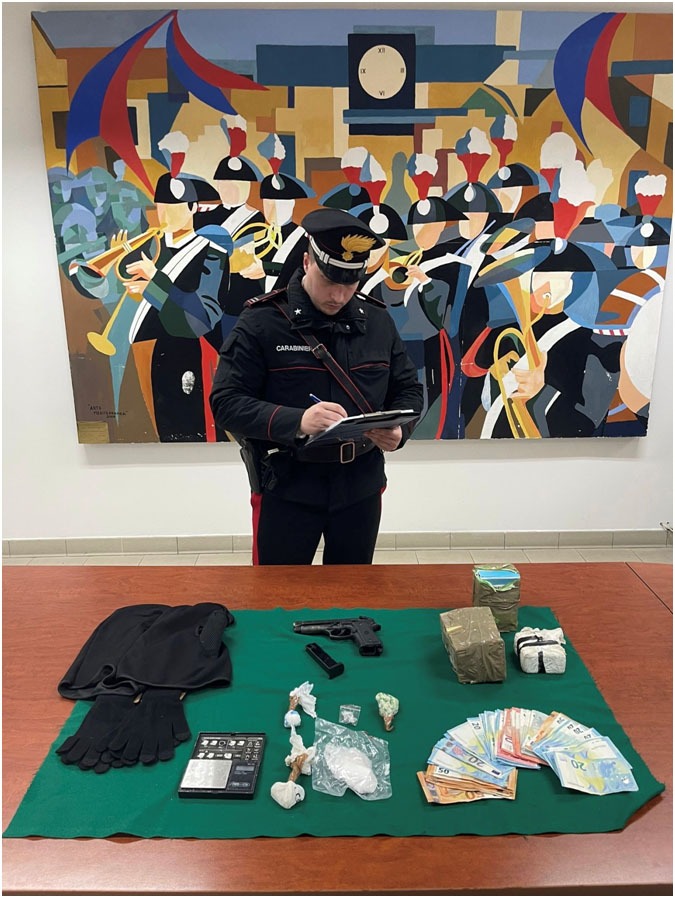 Nella giornata di ieri, i Carabinieri della Nucleo Operativo e Radiomobile del Reparto Territoriale di Aprilia hanno arrestato, in flagranza di reato, un ragazzo di 20 anni del posto, per il reato di detenzione ai fini di spaccio di sostanze stupefacenti e detenzione abusiva di arma comune da sparo. Nello specifico i Carabinieri, nell’ambito dell’incessante controllo del territorio, che a seguito degli ultimi accadimenti è stato ulteriormente intensificato, anche mediante l’impiego della S.I.O. dell’8° Reggimento Carabinieri Lazio, hanno eseguito una perquisizione personale e domiciliare nei confronti dell’indagato, rinvenendo nella sua disponibilità una pistola giocattolo, modificata e resa offensiva, con canna alterata e dotata di filettatura utile per l’uso del silenziatore, comprensiva di serbatoio contenente una cartuccia cal. 7.65, un paio di guanti e un passamontagna. Inoltre, l’indagato è stato trovato in possesso di sostanza stupefacente di diversa natura, tra cui 27 grammi di sostanza stupefacente di tipo di “cocaina/crack”, 65 grammi di sostanza stupefacente di tipo “cocaina”, una modica quantità di sostanza stupefacente di tipo “hashish”, nonché materiale utile per il confezionamento dello stupefacente, tra cui 2,750 di sostanza da taglio, 1 bilancino di precisione e, in ultimo, di 1.570 euro in contanti, che si ritiene essere il provento di pregressa attività illecita,