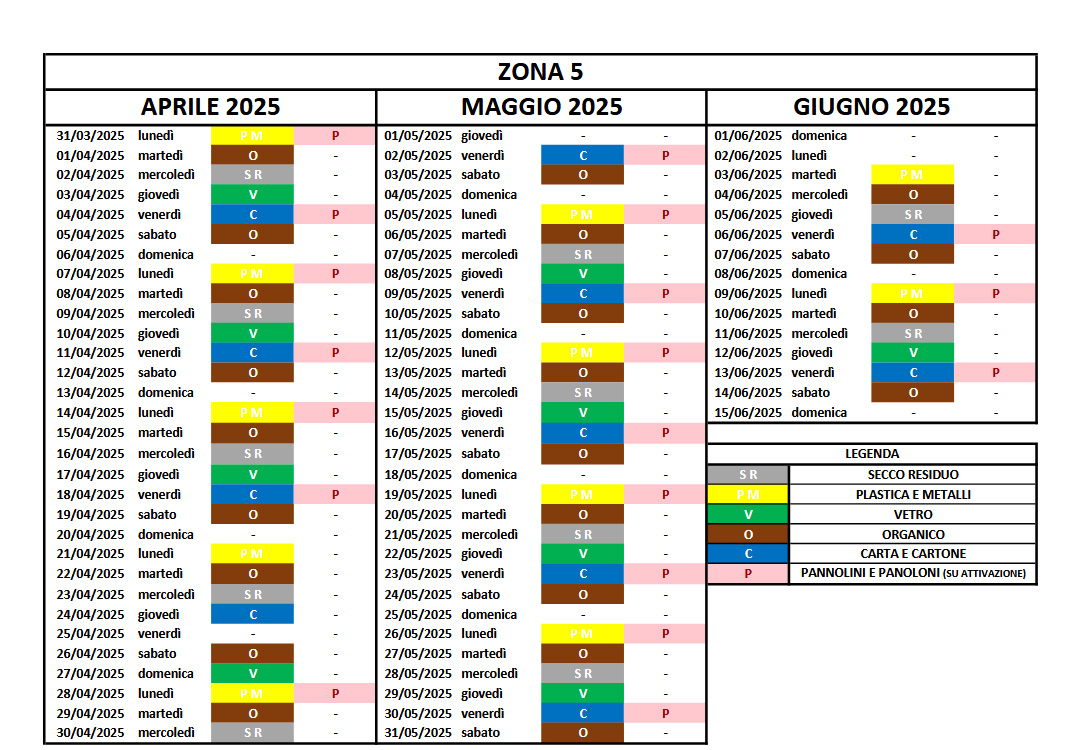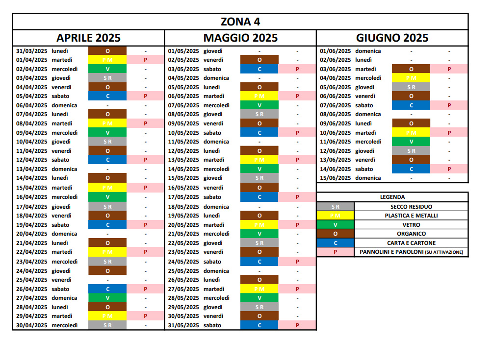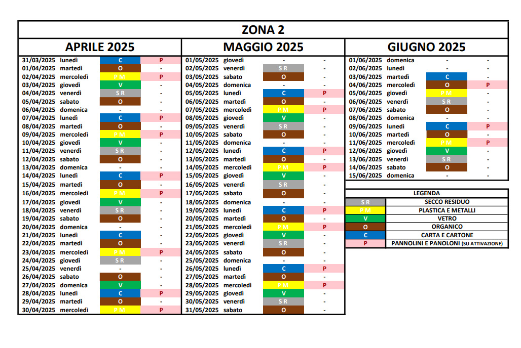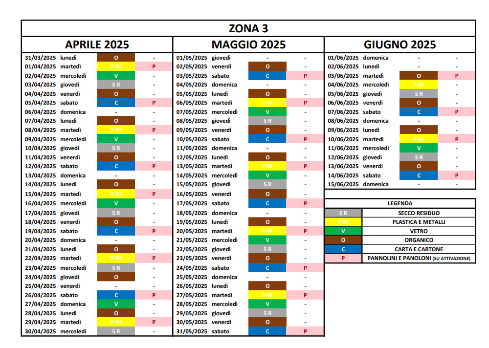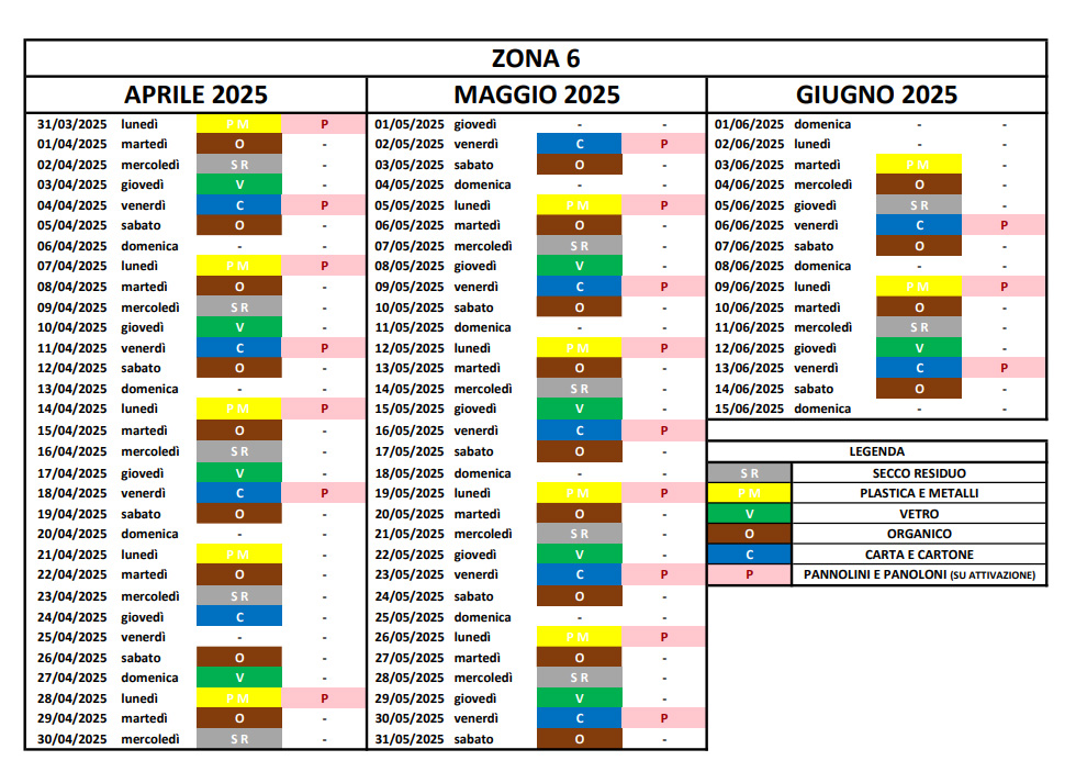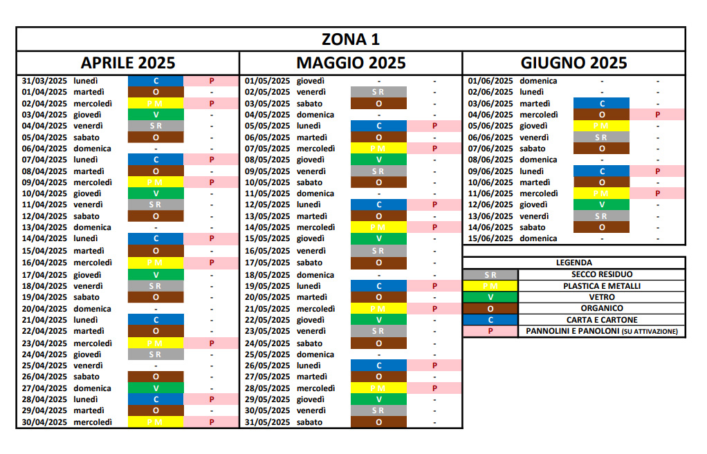 Ci saranno delle modifiche nel calendario della raccolta differenziata porta a porta per il Comune di Aprilia. Di seguito gli schemi zona per zona, dalla zona 1 alla zona 6, con gli eventuali cambi di programma da oggi e fino a giugno 2025 quando poi si procederà ad inserire il calendario estivo della raccolta.