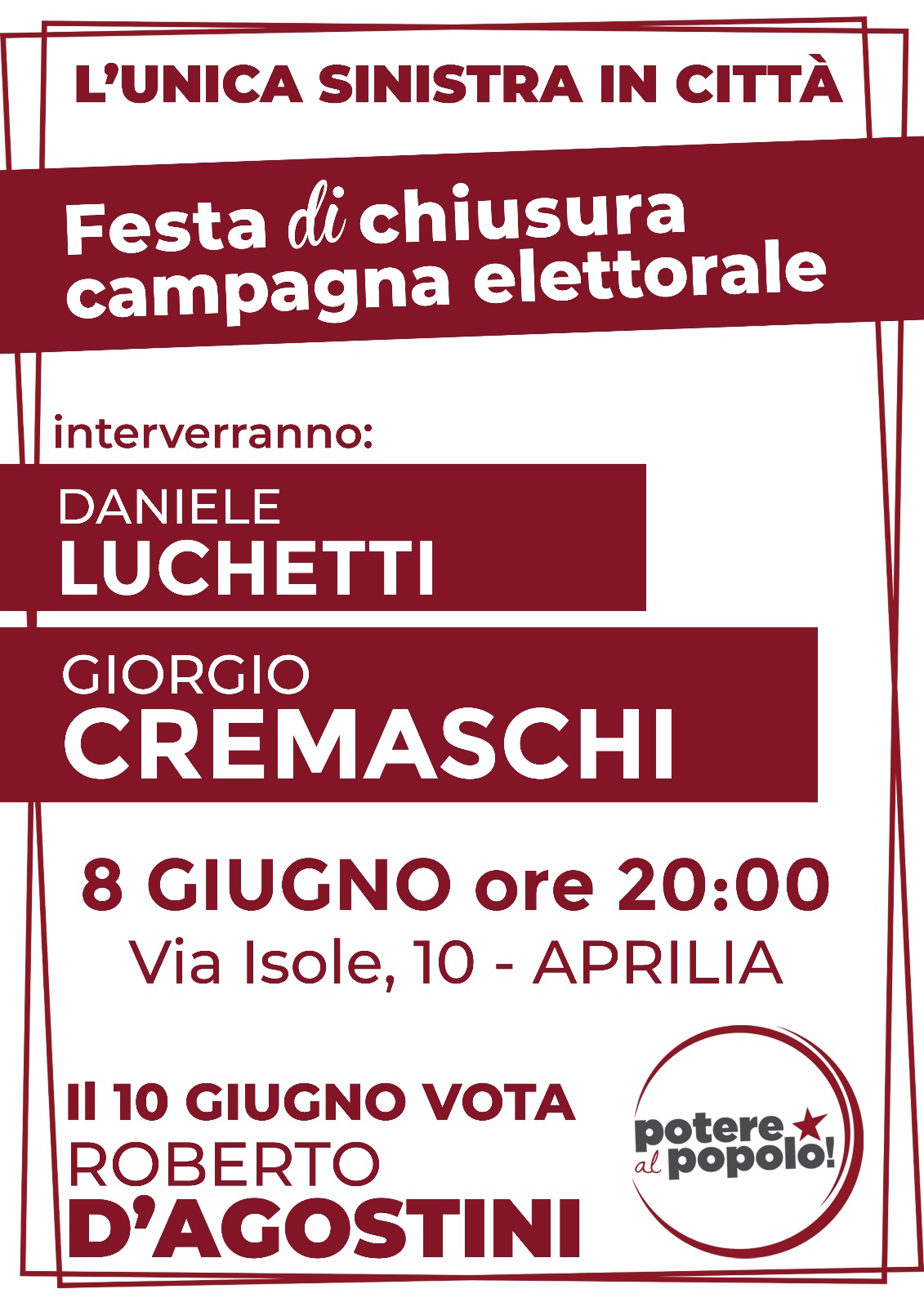 Venerdì prossimo, 8 giugno, Potere al Popolo - Aprilia chiuderà la campagna elettorale all'Open di Via delle Isole n°10, a partire dalle ore 20.00, con un appuntamento ricco di musica, cibo e contenuti politici.A sostegno del nostro Candidato Sindaco, infatti, interverranno anche Daniele LUCHETTI (PaP Lazio) e Giorgio CREMASCHI (PaP Nazionale), i quali animeranno un confronto con i candidati consiglieri e tutti i partecipanti. Concluderà Roberto D'Agostini.A seguire, panini, bibite e DJ SET fino a tarda sera.L'evento sarà preceduto dalla presenza di un banchetto informativo in Piazza Roma, dalle ore 17.30 alle ore 20.00, in occasione del quale Roberto D'Agostini ancora una volta incontrerà la cittadinanza ed illustrerà nel dettaglio il progetto politico della nostra lista.Chiudiamo, così, in festa, questa bellissima campagna elettorale, che ha coinvolto decine di persone e con la quale abbia voluto riportare il dissenso a questo modello di società e le parole d'ordine della Sinistra anche al centro del dibattito politico locale.Questa esperienza ha permesso un confronto diretto con i lavoratori, i pensionati e gli studenti del territorio, trovando in tutti sempre maggiore interesse per la nostra attività e rafforzando ulteriormente l’organizzazione interna. Abbiamo portato il nostro programma nelle strade, nelle piazze, nei luoghi di lavoro e di studio; un programma di lotta, forgiato sulla volontà di stare sempre dalla parte di chi per troppo tempo è stato sfruttato e dimenticato.Per una città a misura di lavoratori, studenti e pensionati.