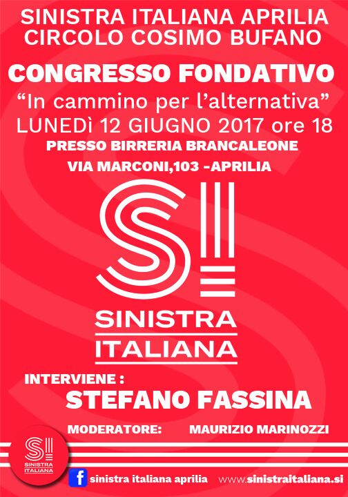 Si svolge questo pomeriggio alle 18 presso l’ex Birreria Brancaleone ad Aprilia il primo congresso del circolo Cosimo Bufano di Sinistra Italiana. Sarà presente l'Onorevole Stefano Fassina.