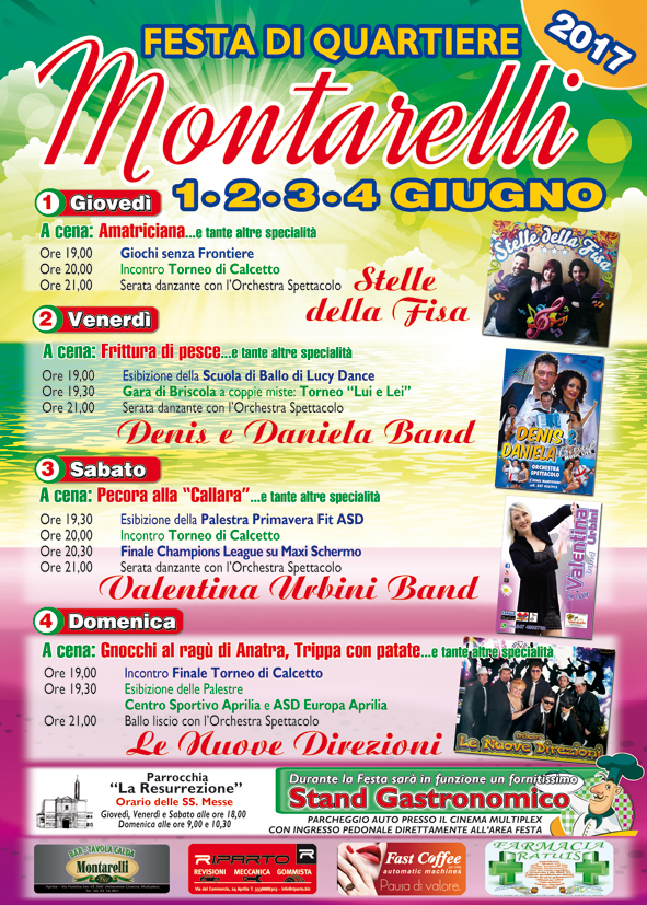 Prosegue per tutto il fine settimana la festa al “Quartiere Montarelli” ad Aprilia. L’evento - iniziato giovedì scorso, 1° giugno, si chiude domani, domenica 4 giugno: “Sarà una festa nel segno della continuità di intenti che sempre ci ha caratterizzato – spiegano gli organizzatori - e contraddistinto per il nostro impegno di regalare al nostro Quartiere momenti di sempre più rara aggregazione sociale, di puro divertimento con tanti spettacoli, il tutto “condito” da una proposta gastronomica davvero notevole, da tutti stimata ed apprezzata e di cui noi andiamo fieri.