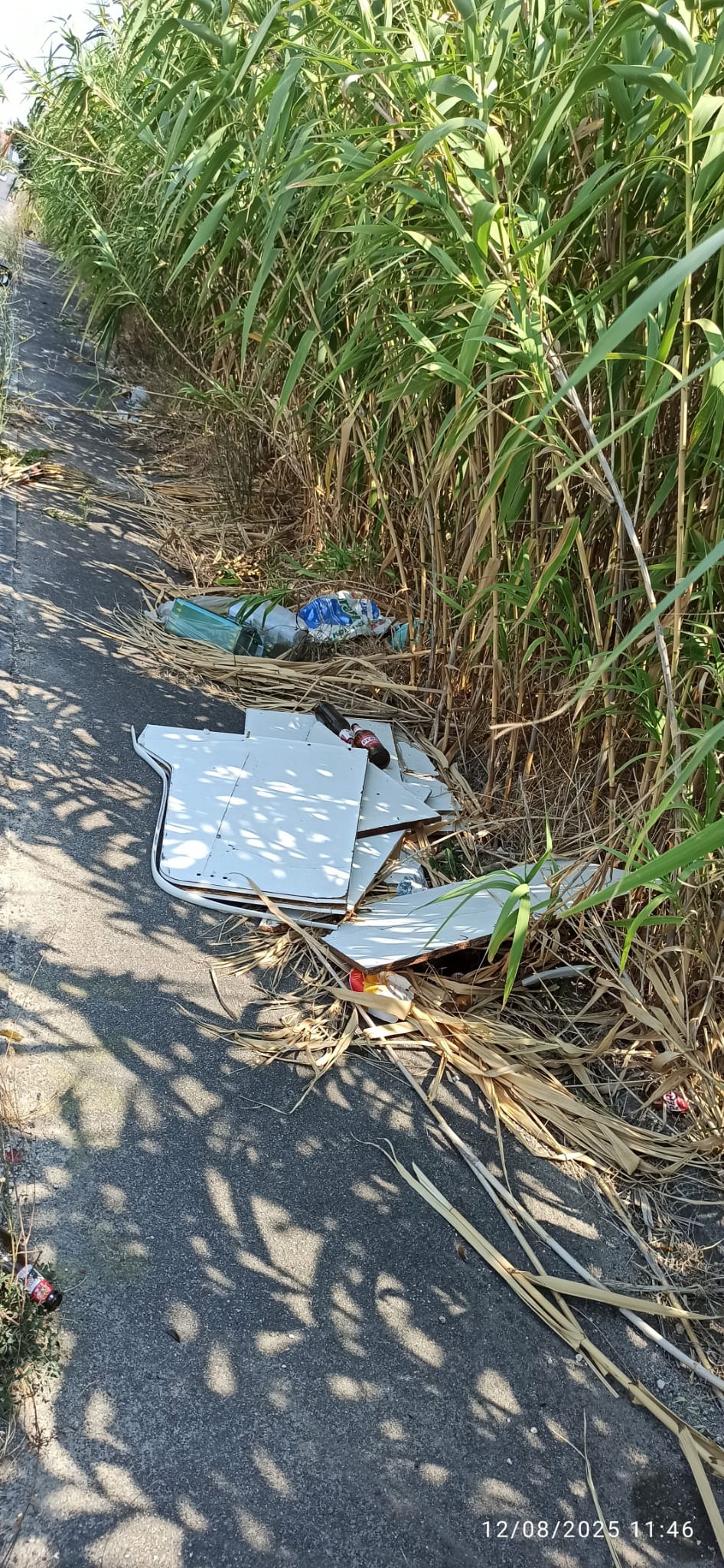 Dalla parte opposta del cedimento, davanti ad una cabina dell’ENEL, altre buste di rifiuti e un ombrellone rotto. Nella parte finale della via, prima di uscire sulla via Nettunense, tanto per confermare il degrado in cui versa la via, una distesa variegata di rifiuti abbandonati, pneumatici compresi.