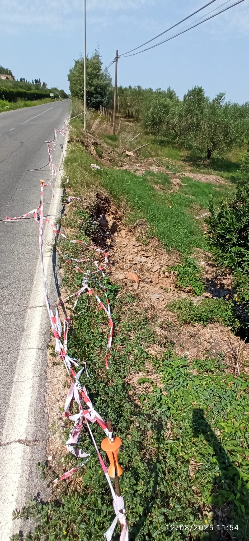 Quel cedimento è stato segnalato con dei picchetti metallici non evidenziati, se non con dello sparuto nastro segnaletico bianco e rosso della Polizia Locale, insufficiente già di giorno, figuriamoci di notte senza neanche la prevista segnalazione luminosa. L’unico segnale stradale, posizionato a circa 12 mt prima della delimitazione, è quello indicante lavori in corso, ritrovato sdraiato sulla carreggiata dal sottoscritto. I picchetti sono stati piantati pericolosamente all’interno della corsia a circa un metro dalla striscia di delimitazione della carreggiata invadendo la strada senza che ci sia un segnale di rallentamento e restringimento della sede stradale. I picchetti risultano piegati a “L”, probabilmente dal passaggio di mezzi pesanti ma essendone nascosta la presenza perché sembrano più esterni, rappresentano un pericolo occulto soprattutto per ciclisti e motociclisti. Bisognerebbe mettere in sicurezza l’area quanto prima.