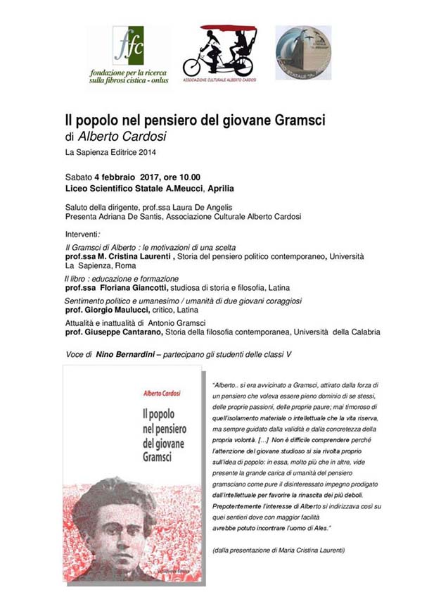 Domani mattina alle 10 presso il Liceo Meucci di Aprilia, verrà presentato il libro di Alberto Cardosi, dal titolo: “Il popolo nel pensiero del giovane Gramsci”. Saranno numerosi gli interventi di professori ed esperti. Parteciperanno i ragazzi delle classi quinte.