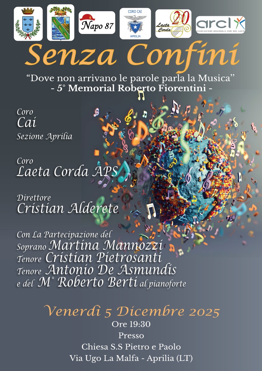Aprilia, “Senza Confini”: questo venerdì 5 Dicembre la quinta edizione del concerto in memoria di Roberto Fiorentini. A 6 anni dalla sua scomparsa, l’associazione Napo87 a lui dedicata, organizza una serata in collaborazione con i cori Cai e Laeta Corta di Aprilia. L’appuntamento, come ogni anno, è presso la parrocchia Santi Pietro e Paolo. Alle 18.30 ci sarà la messa e alle 19.30 inizierà il concerto. L’ingresso è libero.