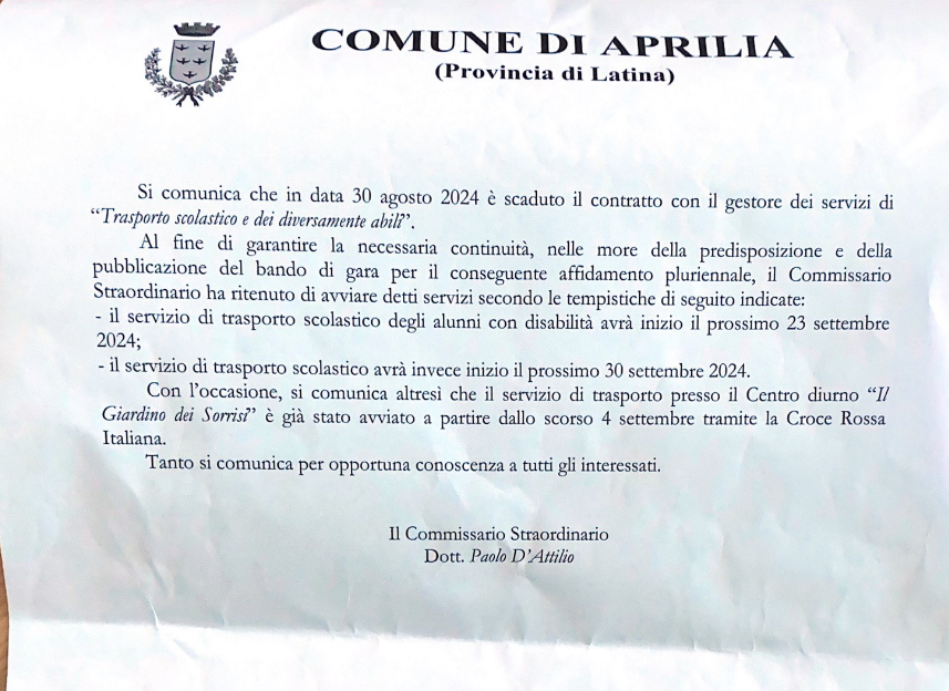 Aprilia senza servizio scuolabus - Genitori in sit-in oggi pomeriggio sotto ai portici del Comune di piazza Roma. Mamme, padri e nonni si sono riuniti per poter parlare direttamente con il Commissario Paolo D'Attilio e avere risposte sull'assenza del servizio di trasporto scolastico, anche per i ragazzi con disabilità. Il malumore non è stato placato nonostante il Commissario abbia voluto ricevere una piccola delegazione composta da tre sole mamme per consegnargli una comunicazione piuttosto scarna. Il Commissario ha negato l'accesso all'incontro in Municipio anche ai giornalisti, prendendo tempo. Evidentemente le cose da risolvere sono ancora tante. I genitori comunque non hanno smesso di manifestare, non si sentono sereni. Non hanno avuto tutte le risposte che cercavano.