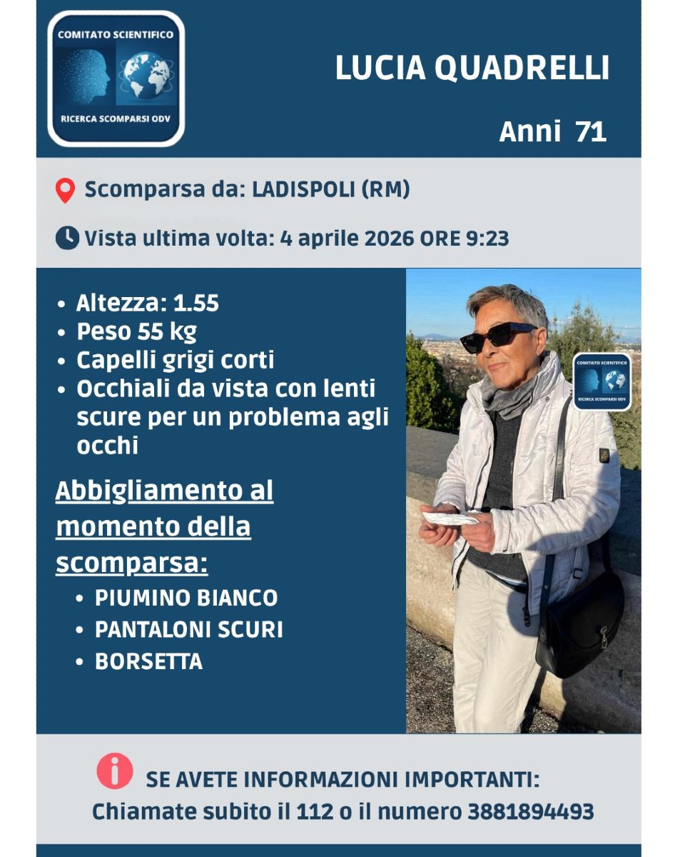Va in albergo a Ladispoli, ma poi fa perdere le sue tracce. E’ scomparsa dallo scorso 4 aprile, Lucia Quadrelli di Aprilia: 71 anni alta 1 metro e 55 centimetri, ha i capelli grigi. L’appello dei familiari passa per il web, ma soprattutto tramite la trasmissione Rai “Chi l’ha visto?”. La signora Lucia ha lasciato tutti i suoi effetti personali nella stanza di albergo a Ladispoli. Ogni tentativo di contattarla al momento è risultato vano.