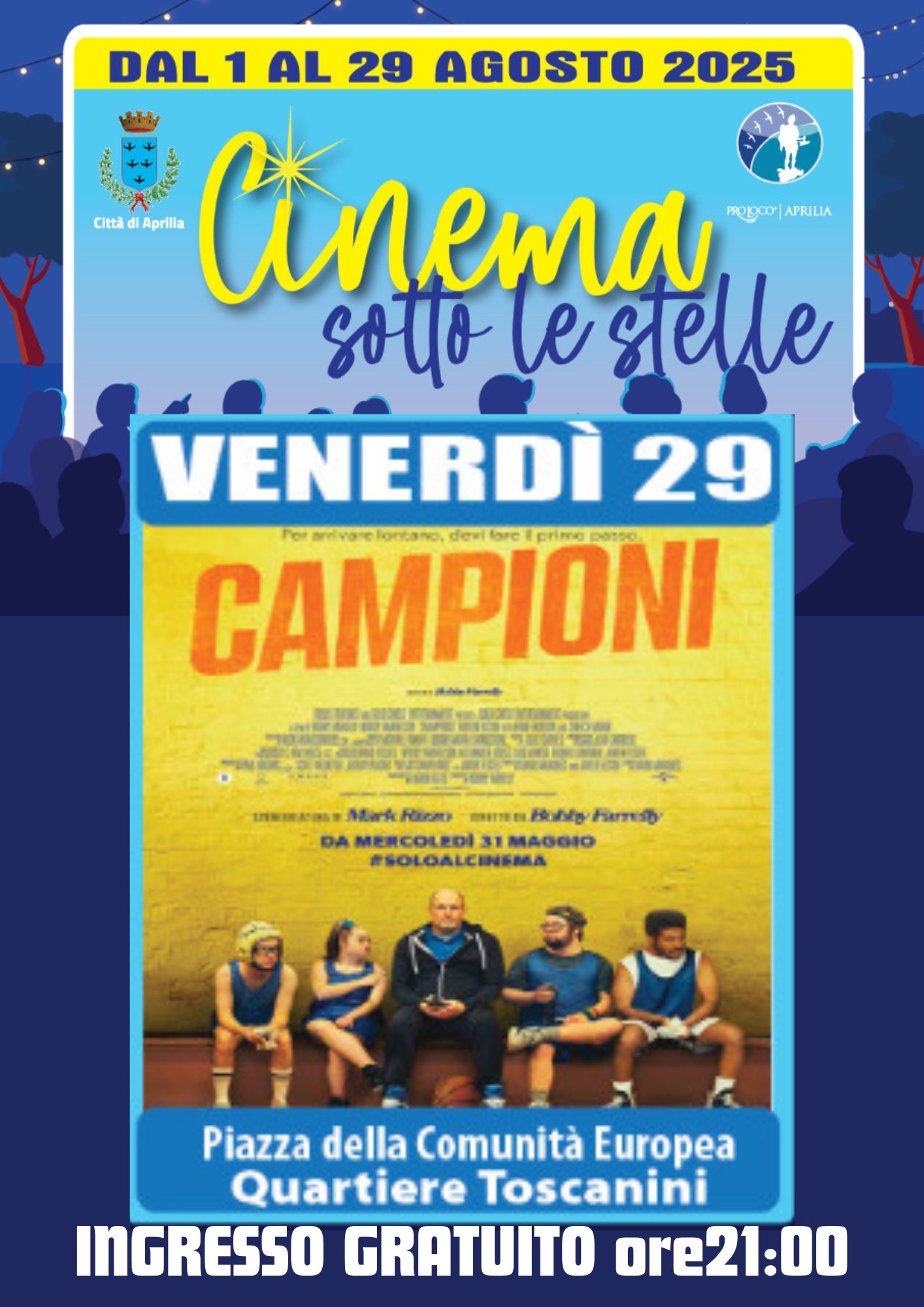 Aprilia, si chiude la rassegna Cinema Sotto le Stelle”. Stasera in Piazza della Comunità Europea, nel quartiere Toscanini, l’ultima proiezione, condizioni meteo permettendo. Alle 21.00 verrà proposto il film “Campioni”. L’ingresso è gratuito.