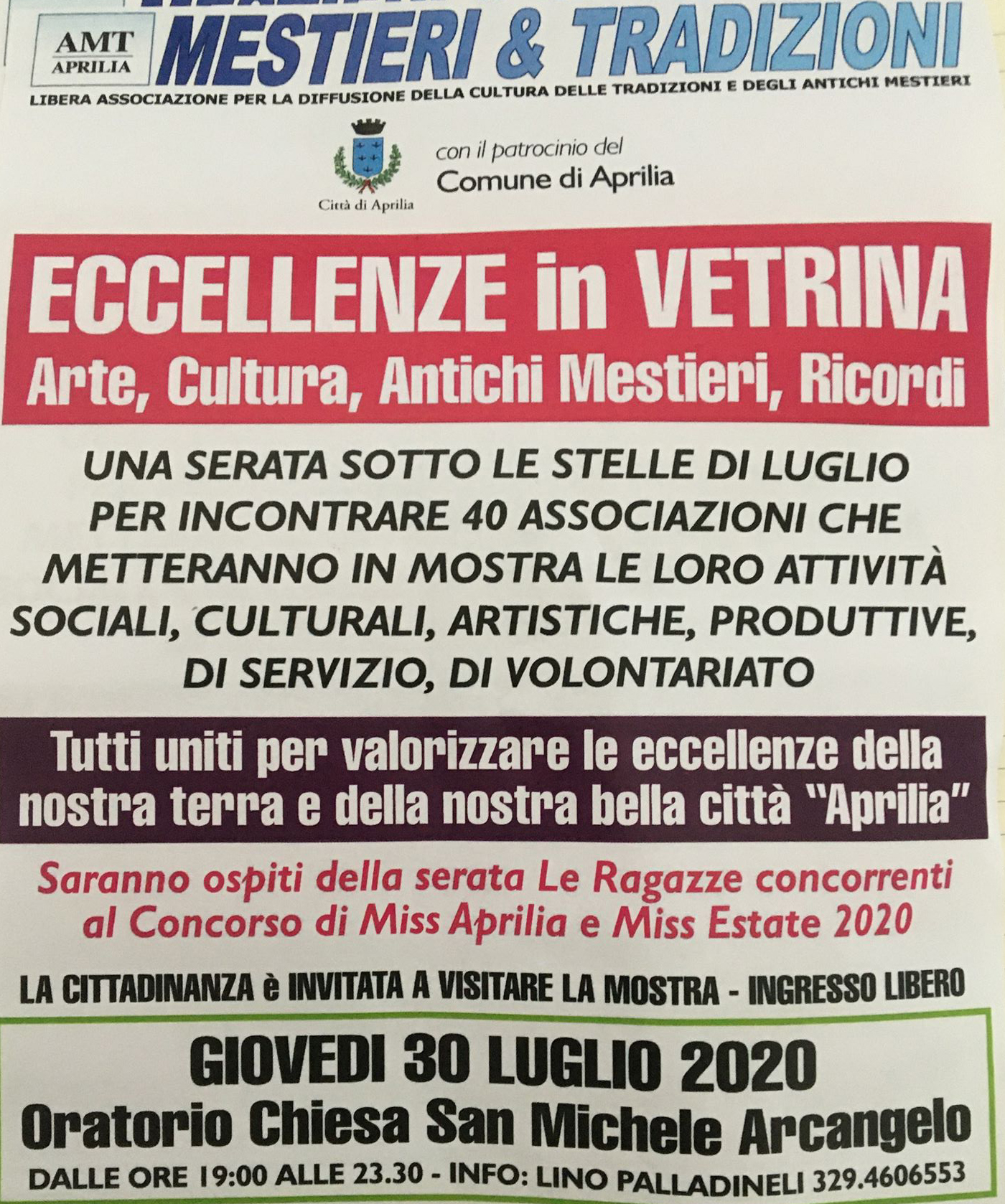 Questa sera presso l’oratorio San Michele ad Aprilia ci sarà la mostra: “Eccellenze in vetrina, arte, cultura, antichi mestieri e ricordi” organizzata dall’associazione Mestieri e tradizioni, di Lino Palladinelli. Un appuntamento che si rinnova, già proposto alcune settimane fa. Questa sera dalle 19 alle 23:30 si potranno ammirare le foto in mostra e le attività di 40 associazioni. Saranno ospiti della serata le ragazze concorrenti al Concorso Miss Aprilia e Miss Estate 2020.