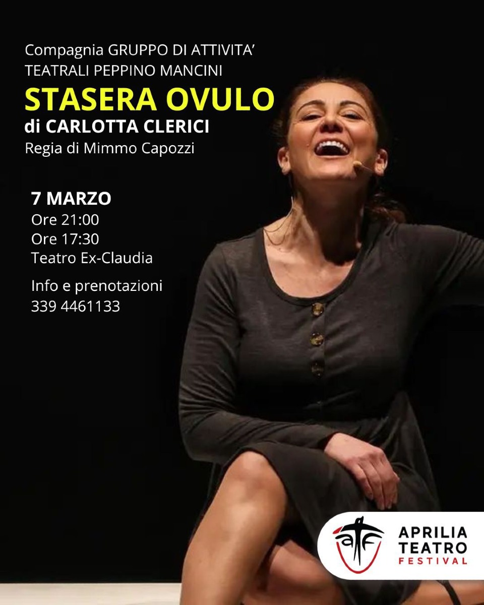 APRILIA TEATRO FESTIVAL Seconda Edizione. Il “Gruppo Attività Teatrali Peppino Mancini” di Fasano sarà ad Aprilia sabato 7 marzo ore 21.00. In scena “Stasera Ovulo” REPLICA STRAORDINARIA ore 17.30
