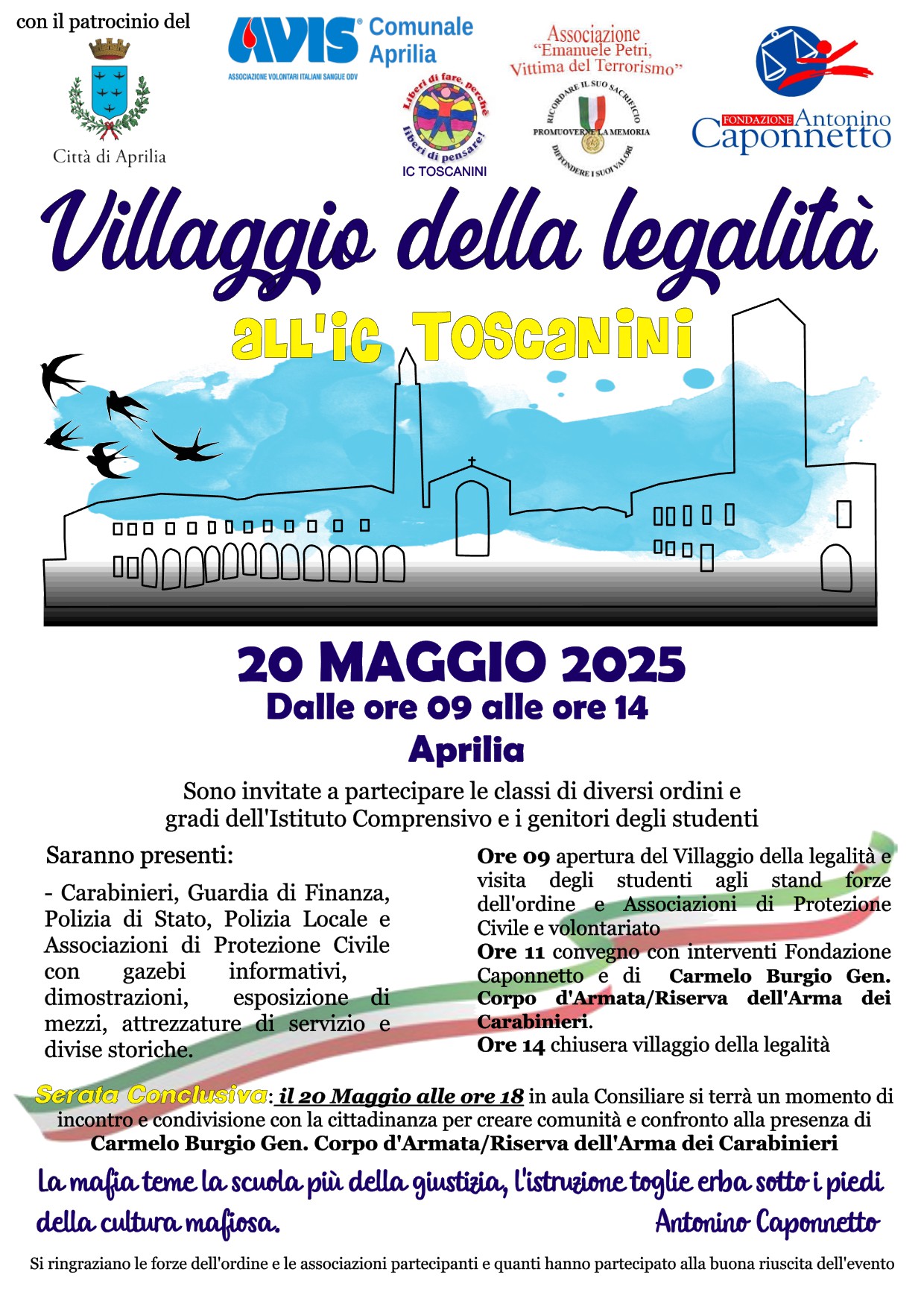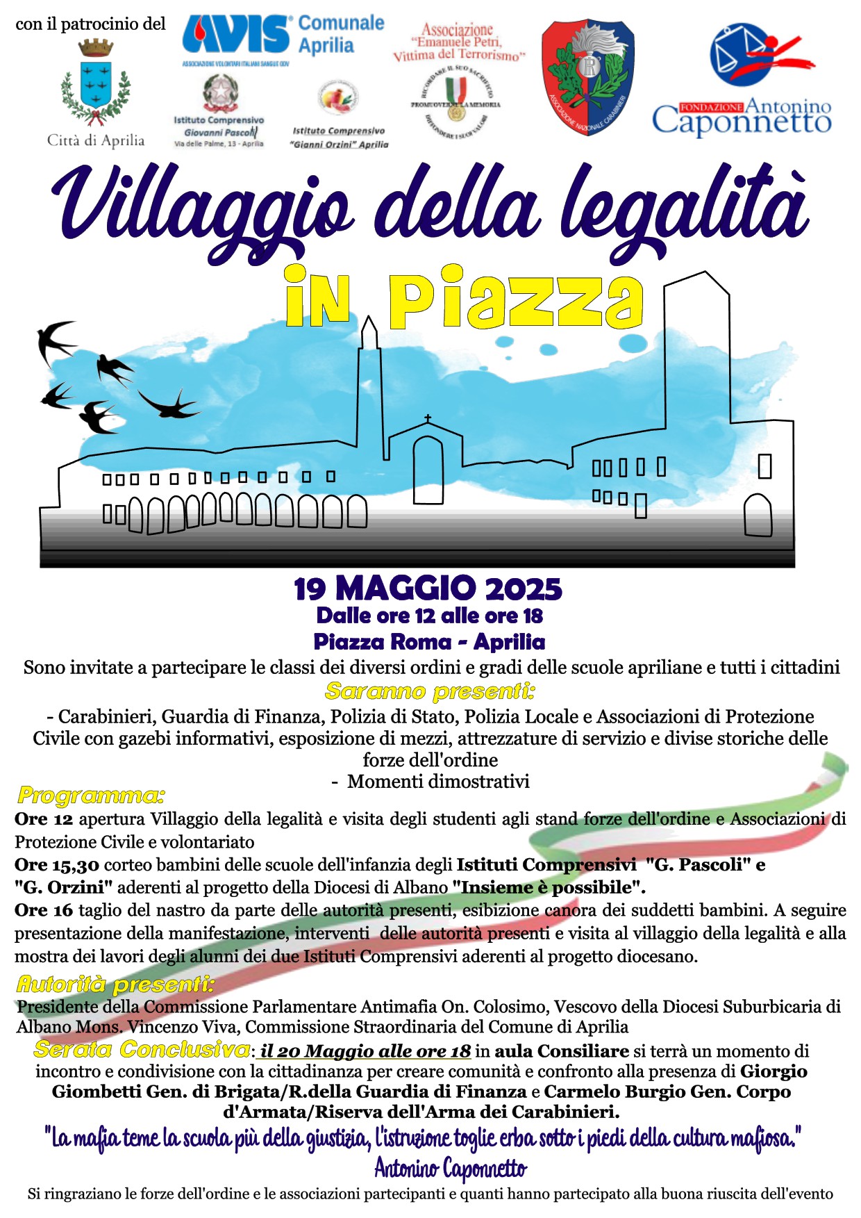 La Fondazione Caponnetto, per il quarto anno consecutivo in collaborazione le Forze dell’ordine, l’Associazione Nazionale Carabinieri, Avis Comunale propone per i piccoli cittadini apriliani il Villag...