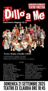 Domenica 21 settembre alle 18.45 presso il Teatro Finestra all’ex Claudia si replica “DILLO A ME”: uno spettacolo che porta in scena la tematica del bullismo.Il lavoro è il frutto di un anno di labora...