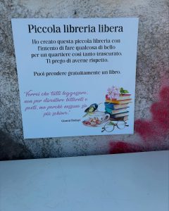 “Ho desiderato tanto questa Libreria Libera davanti casa mia. - Spiega Francesca in un post sui social - Ho voluto qualcosa che “stonasse” con tutto il contesto intorno, che è un contesto di trascuratezza, con la strada piena di buche e un terreno accanto che è diventato una discarica. L’ho fatto perché sono stanca di tornare a casa e vedere il “brutto”, ho bisogno di bellezza. Mi sento impotente davanti a tutto questo, ma nell’impotenza c’è sempre qualcosa che possiamo fare. Spero che le persone ne abbiano rispetto. Troverete libri per adulti e bambini che potrete prendere gratuitamente.”