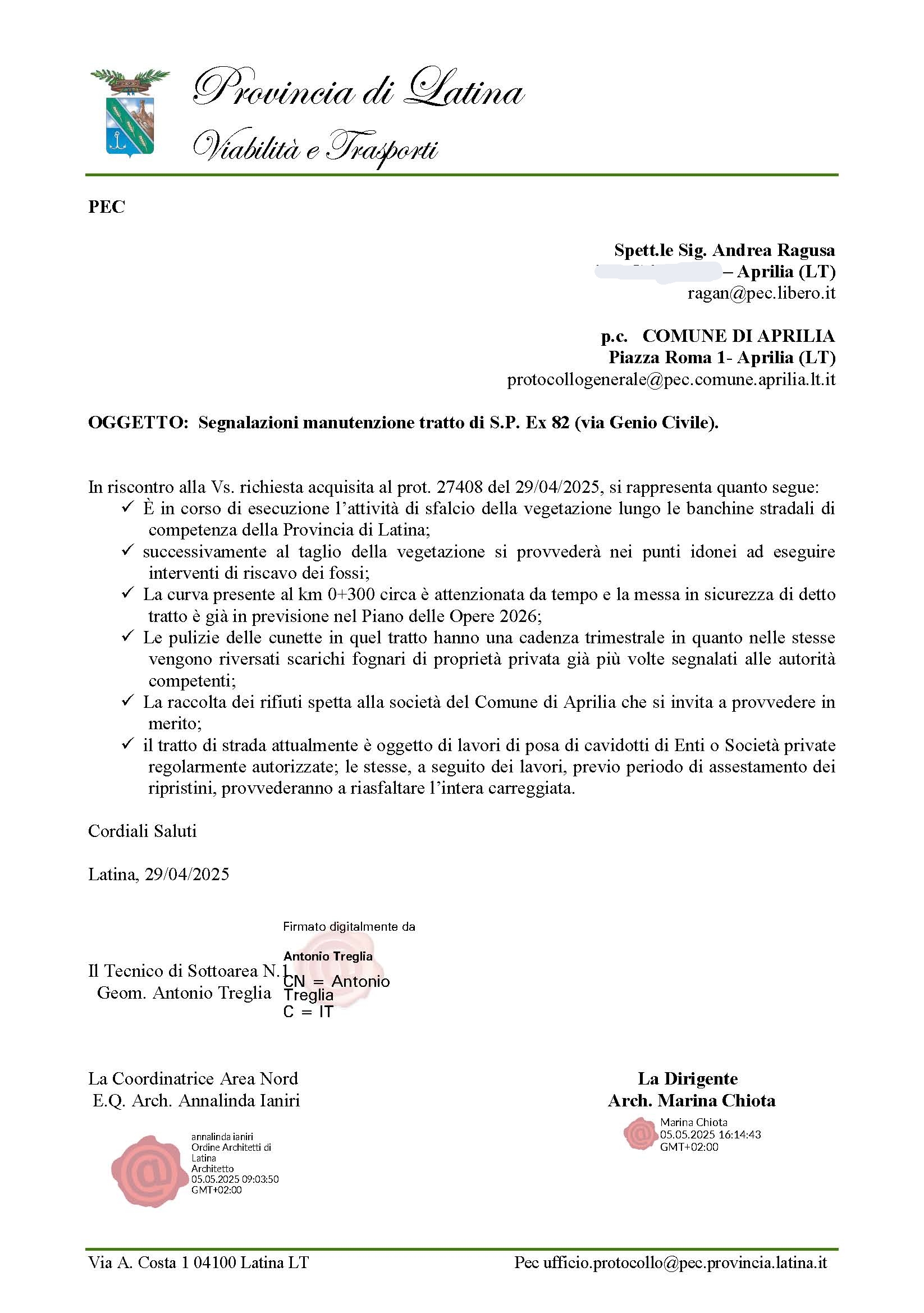 ü All’Ufficio provinciale, si segnala che lungo la strada provinciale Ex 82 (via del Genio Civile), ad Aprilia, nel segmento compreso tra il civico 3 e il civico 11, tratto già ben noto per la presenza dell’unica curva e per l’alto tasso di incidentalità, l’erba alta e le fronde hanno coperto alcuni dei segnali stradali (compresi quelli ad alta visibilità che indicano la presenza della curva pericolosa), andando così ad aumentare la pericolosità del tratto stesso. Proprio visto l’alto numero di incidenti verificatosi in quel tratto (dei quali alcuni anche mortali), sarebbe auspicabile valutare metodi che possano aiutare a prevenirli come ad esempio l’illuminazione del tratto, l’installazione di segnalatori lampeggianti, di dissusori, di bande rumorose, di autovelox, ecc..