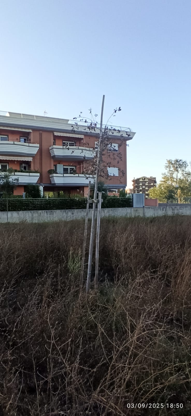 Nell’area verde sono presenti anche dei giovani alberi che sembra siano stati messi a dimora recentemente, ma che oltre ad essere vistosamente inclinati, si stanno seccando in quanto l’impianto di irrigazione lì presente non ha mai funzionato.