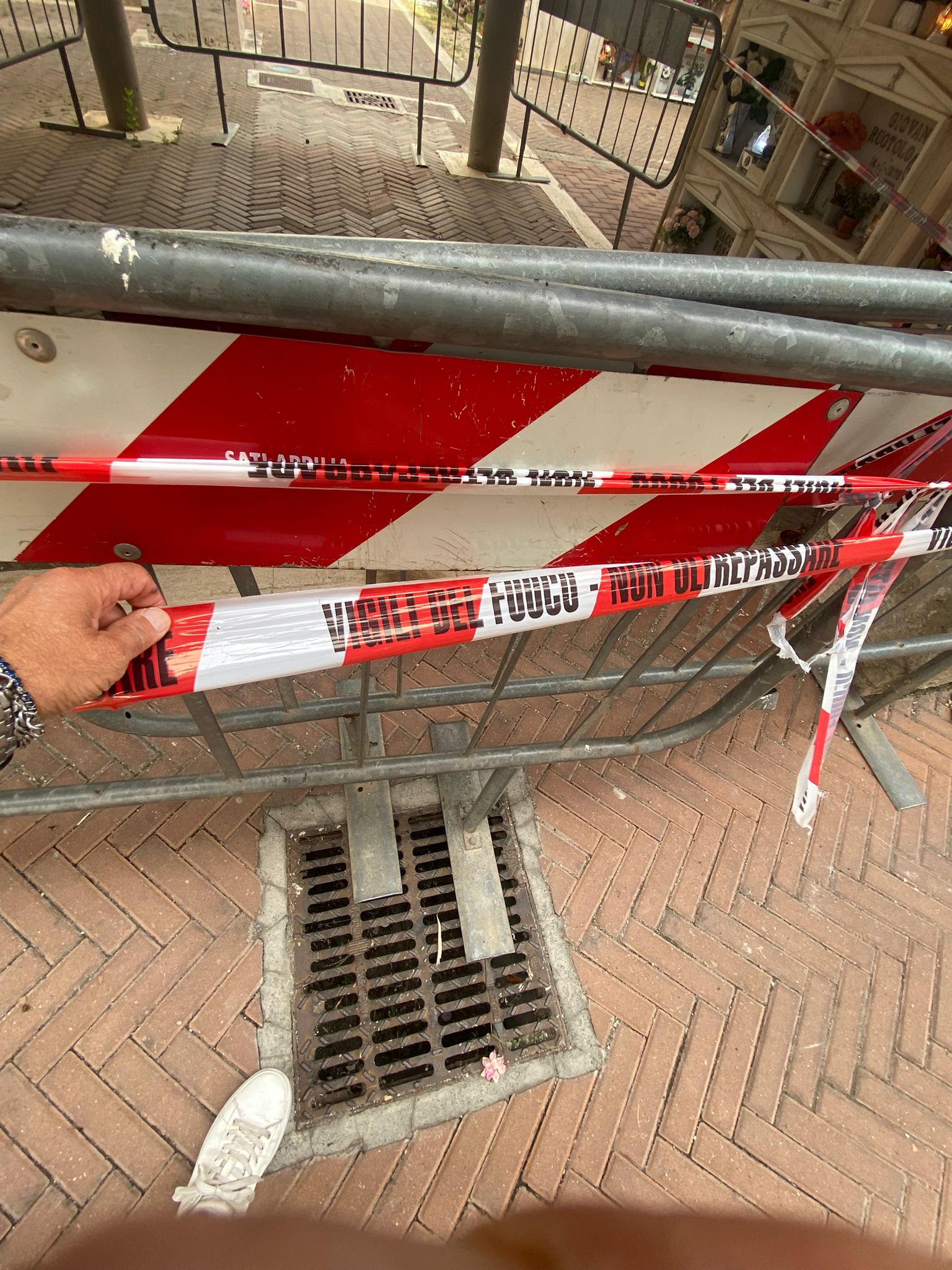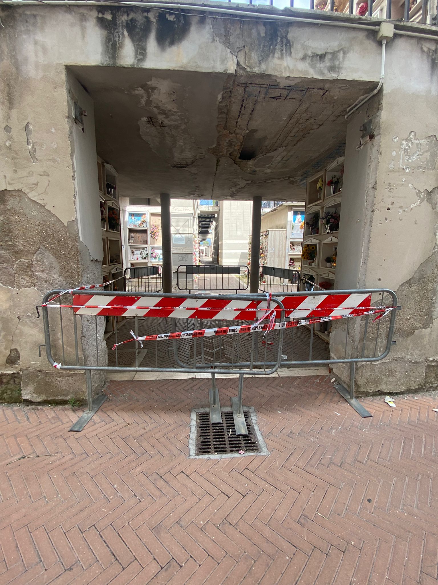 Intervento urgente di messa in sicurezza presso il Cimitero di Aprilia. La segnalazione arriva da Andrea Ragusa dei 5 Stelle. Oggi pomeriggio sono intervenuti i vigili del fuoco di Aprilia per delimitare alcune aree del cimitero che risultano pericolose. La struttura da tempo presenta diversi problemi strutturali. Tanti cittadini hanno segnalato guasti, danni pesanti, degrado generale e preoccupante. Pesanti infiltrazioni hanno creato danni in alcune aree.