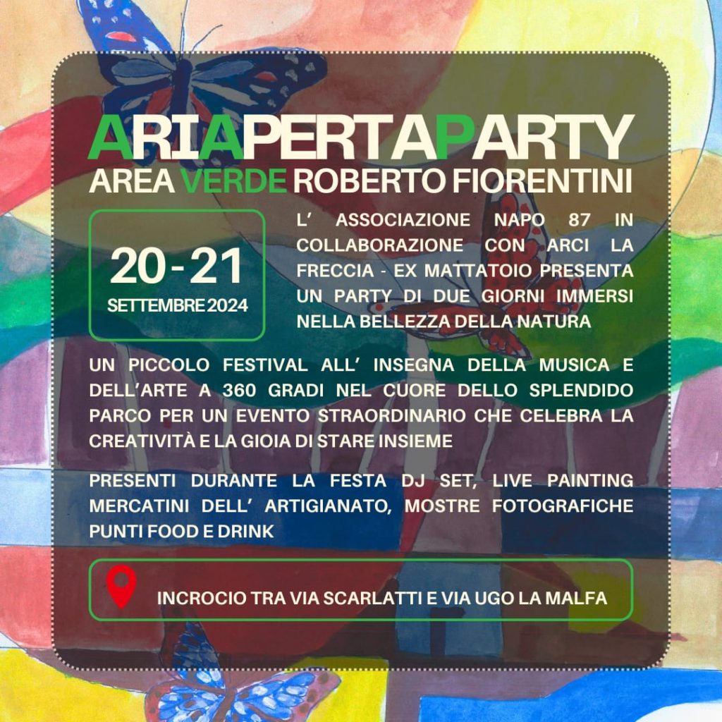 “Ariaperta Party” anche questo sabato 21 Settembre, a partire dalle 19.00 e sino a mezzanotte, al parco “Fiorentini” di Aprilia, all’angolo tra via Ugo La Malfa e via Scarlatti. Ad organizzare l’associazione “Napo87” e l’associazione Arci La Freccia dell’ex Mattatoio. Nell’area verde ci saranno anche, mostre fotografiche, live painting, il mercatino dell’artigianato e dj set.