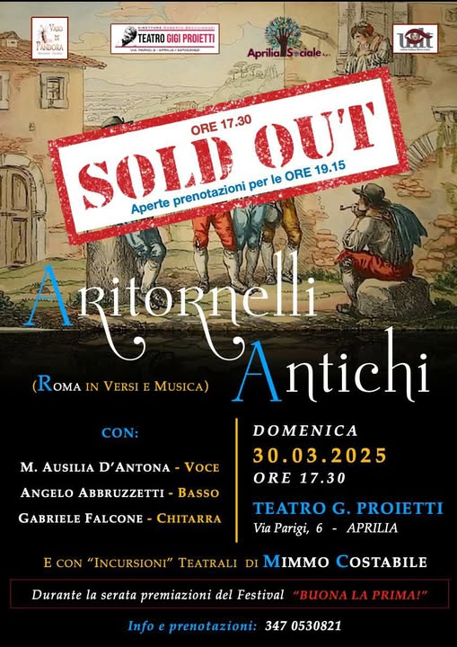 “Aritornelli antichi” (Storie de Roma e de’ Romani): questa domenica 30 marzo ad Aprilia il doppio spettacolo al teatro “Gigi Proietti” di via Parigi. A portarlo in scena i musicisti dell’Archetipo Ensemble: Maria Ausilia D’Antona (voce e mandola), Angelo Abbruzzetti (chitarra e voce) e Gabriele Falcone (chitarra e cori) e con le incursioni teatrali di Mimmo Costabile, che sarà la voce narrante. Si va in scena alle 17.30 (spettacolo già sold out) e si replica alle 19.15 (con biglietti ancora disponibili).