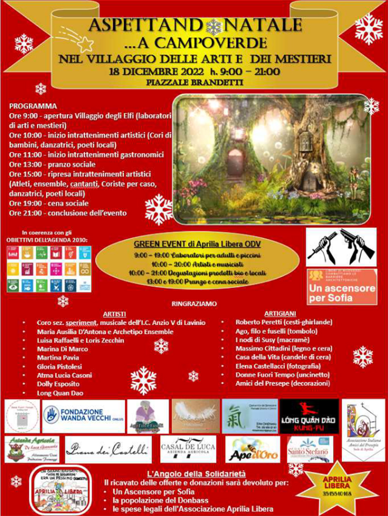 L’associazione culturale “Aprilia Libera” organizza per questa domenica 18 dicembre la prima edizione della manifestazione “Aspettando Natale...a Campoverde", che si svolgerà nel Piazzale Brandetti domani dalle 9.00 alle 21.00. Si tratta di un green event, con l’allestimento di una illuminazione natalizia a zero emissioni dell’Albero del piazzale per tutto il periodo delle festività, mentre domani saranno installati una Slitta di Babbo Natale, un piccolo Presepe vivente in scala reale (con gli animali che le aziende agricole ci porteranno per alcune ore) e Laboratori di arti e mestieri andati perduti, rivolti ad adulti, ragazzi e bambini, intorno al tema del Natale ecosostenibile.