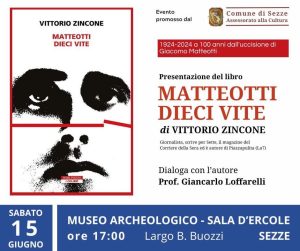 Inoltre l’ANPI di Sezze ha organizzato per lunedì 10 giugno alle 18.30, presso il centro sociale Calabresi, un dibattito sul delitto Matteotti mentre la Compagnia teatrale Le Colonne porterà in scena domenica 9 giugno alle 18.00, lo spettacolo teatrale Diecigiugno ventiquattro scritto da Giancarlo Loffarelli, presso il CineTeatro Evado di Via Melogrosso, nei locali dell’associazione culturale La Macchia.